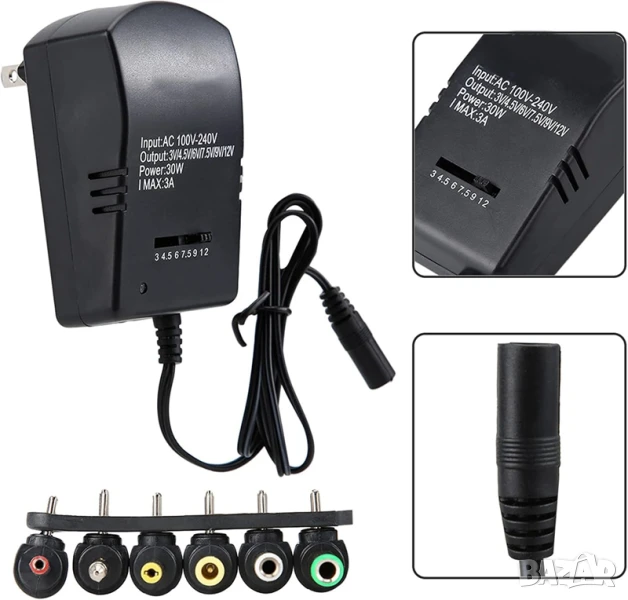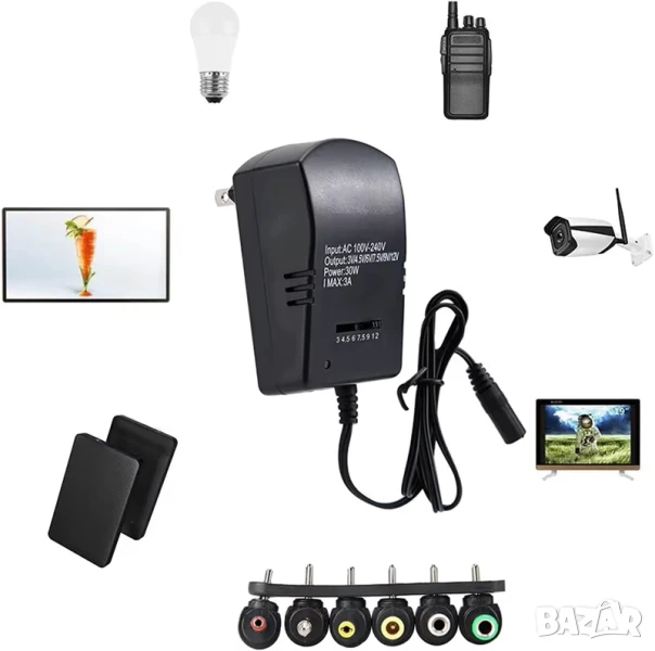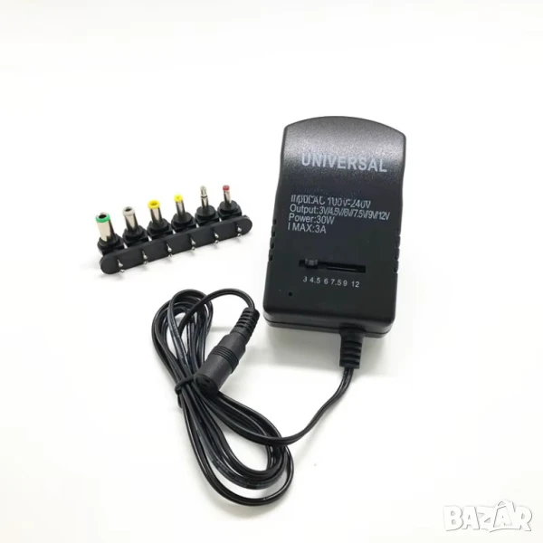 Този универсален захранващ адаптер е надеждно и гъвкаво решение за захранване на множество устройства у дома или в офиса. С мощност 30W и 6 регулируеми изходни напрежения (3V, 4.5V, 6V, 7.5V, 9V, 12V), той може да замени голяма част от специфичните зарядни, опростявайки вашата електроника. Изработен е с висококачествени компоненти за дълъг експлоатационен живот и стабилна работа.