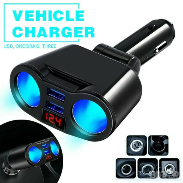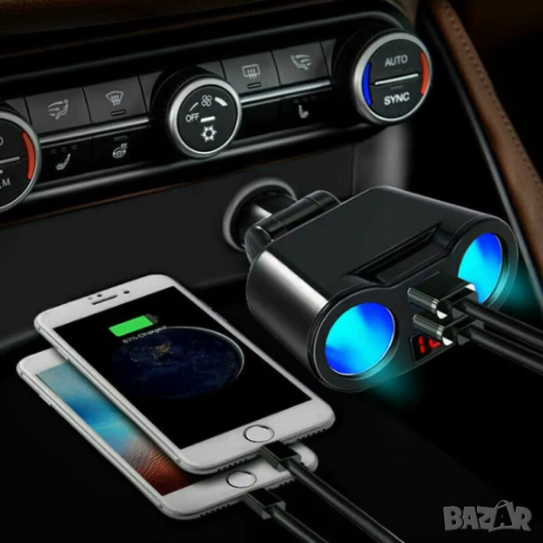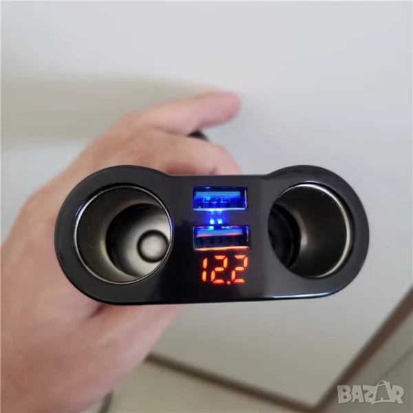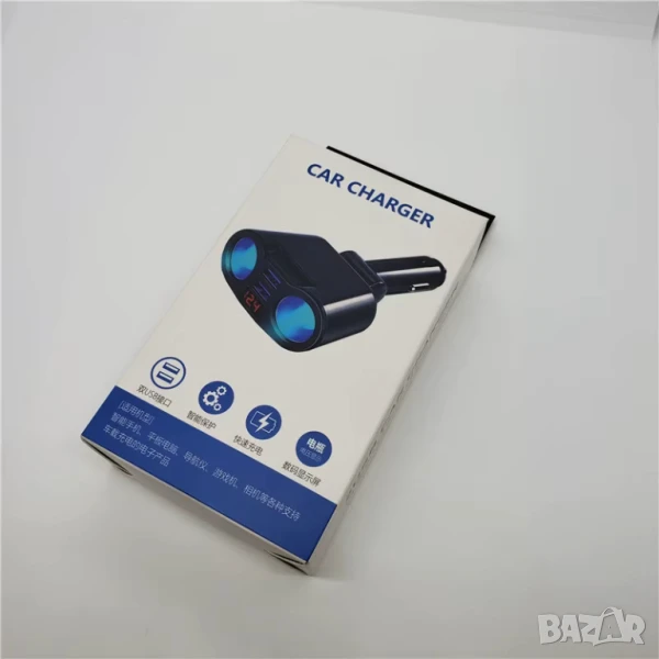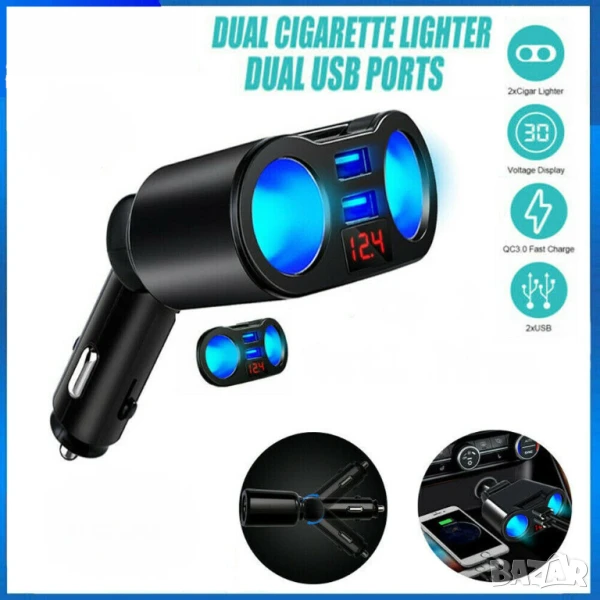 Разклонител за автомобилен контакт + двойно USB QC3.0 бързо зарядно