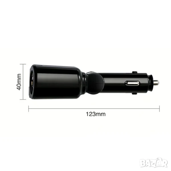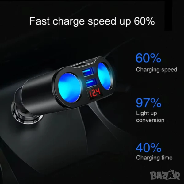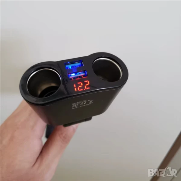 Този адаптер-разклонител се включва в запалката на колата и предлага два USB порта, единият от които поддържа QC 3.0 технология за ускорено зареждане на съвместими устройства. QC 3.0 позволява по-високо напрежение (≈ 9 V или 12 V) и по-интензивен ток (до 3 A, в зависимост от уреда), което намалява времето за зареждане. Вторият порт обикновено е стандартен USB-A 5 V / 2.4 A или подобно, за устройства, които не поддържат QC.