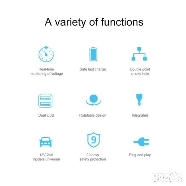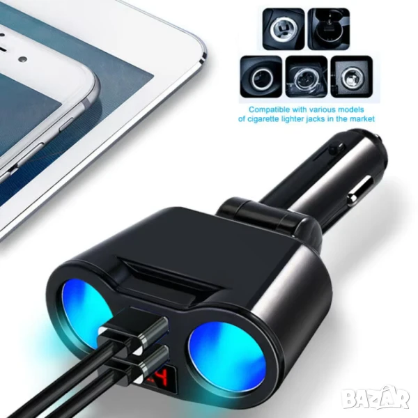 - Двуточков отвор за запалка + двоен USB интерфейс, съвместим с всички видове зареждане на автомобилна електроника на пазара