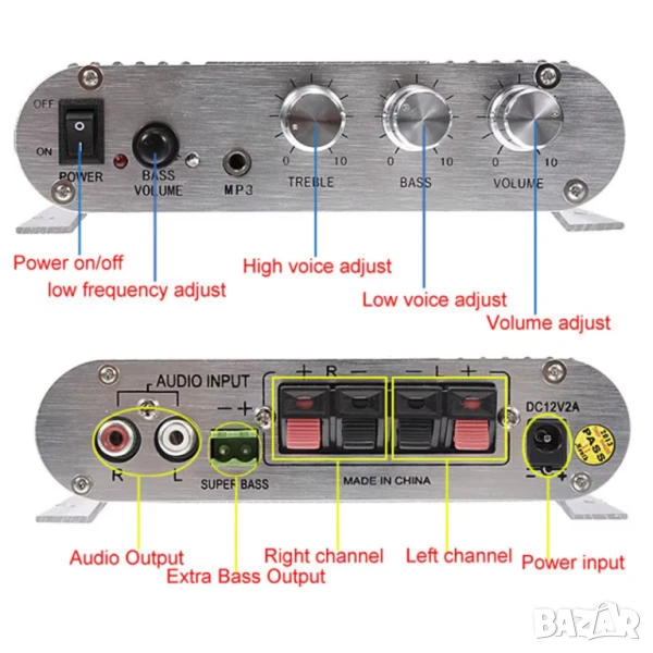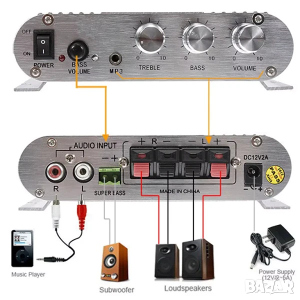 Направете всяко прослушване на музика незабравимо с този изненадващо мощен и многофункционален мини усилвател! Той комбинира висококачествено стерео усилване с отделен сабуфер канал в един компактен дизайн. Перфектен за компютър, телевизор или за създаване на малка домашна аудиосистема. Насладете се на богат и завладяващ звук навсякъде!