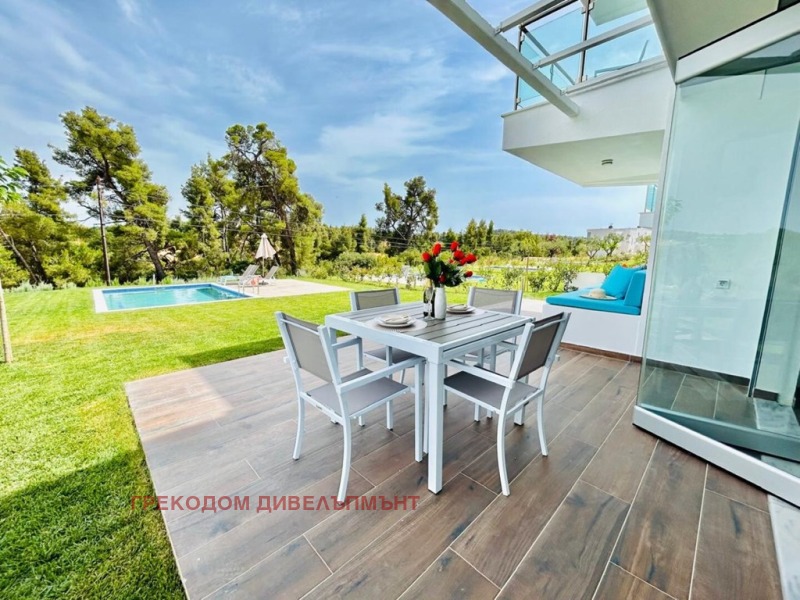 Grekodom предлага за продажба 2-етажна къща ново строителство, с площ 115 кв.м. и двор 900 кв.м. в Сани, Касандра (Халкидики).