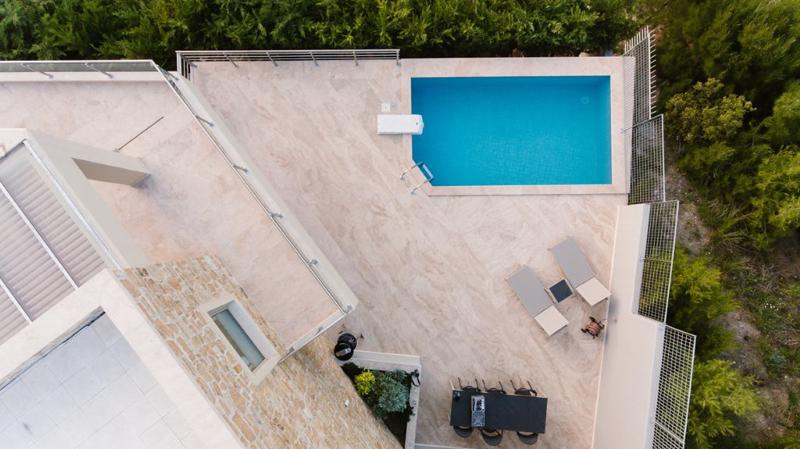 Екстри: голям открит басейн, слънчеви колектори за топла вода, камина, климатик, асансьор, гараж, подово отопление (дизел), алармена система, складово помещение.