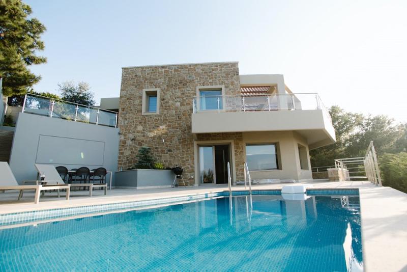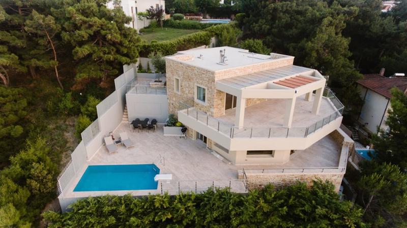 Grekodom предлага за продажба луксозна 3-етажна вила с уникална морска панорама в предградията на Солун (Гърция), на 200 м от морето.
