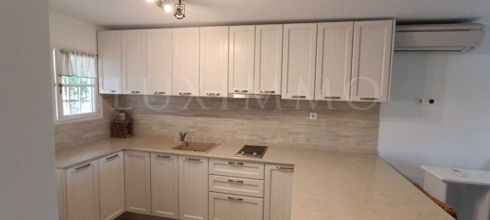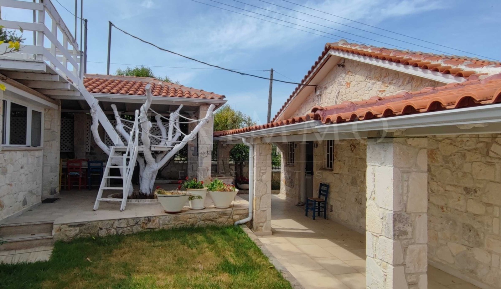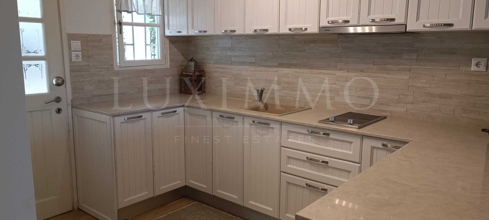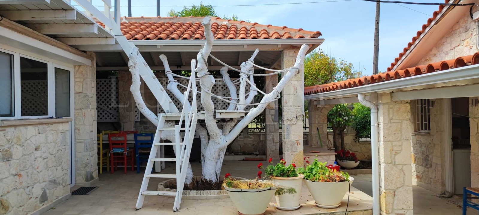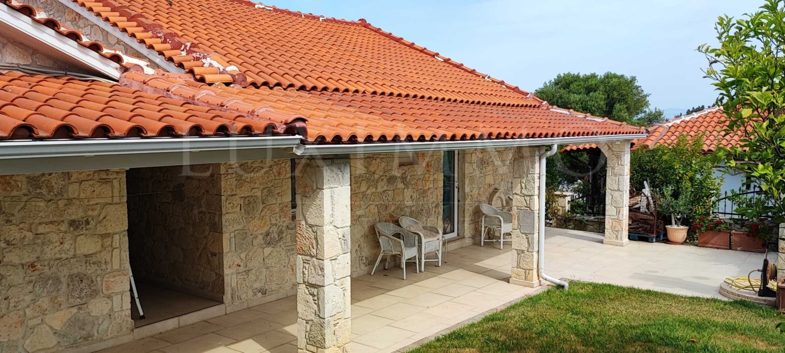 Представяме Ви вила с характерна за Йонийските острови архиктектура в Неа Потидеа, Касандра, Халкидики. Вилата е построена на парцел от 1000 кв.м и се състои от две крила, които са обособени, като 2 самостоятелни апартамента. Всяко крило разполага с дневна и кухнески бокс, две спални и баня с тоалетна. Към къщата има и покрита с пергола лятна кухня с BBQ, двустаен апартамент за помощен персонал, също и складово помещение.