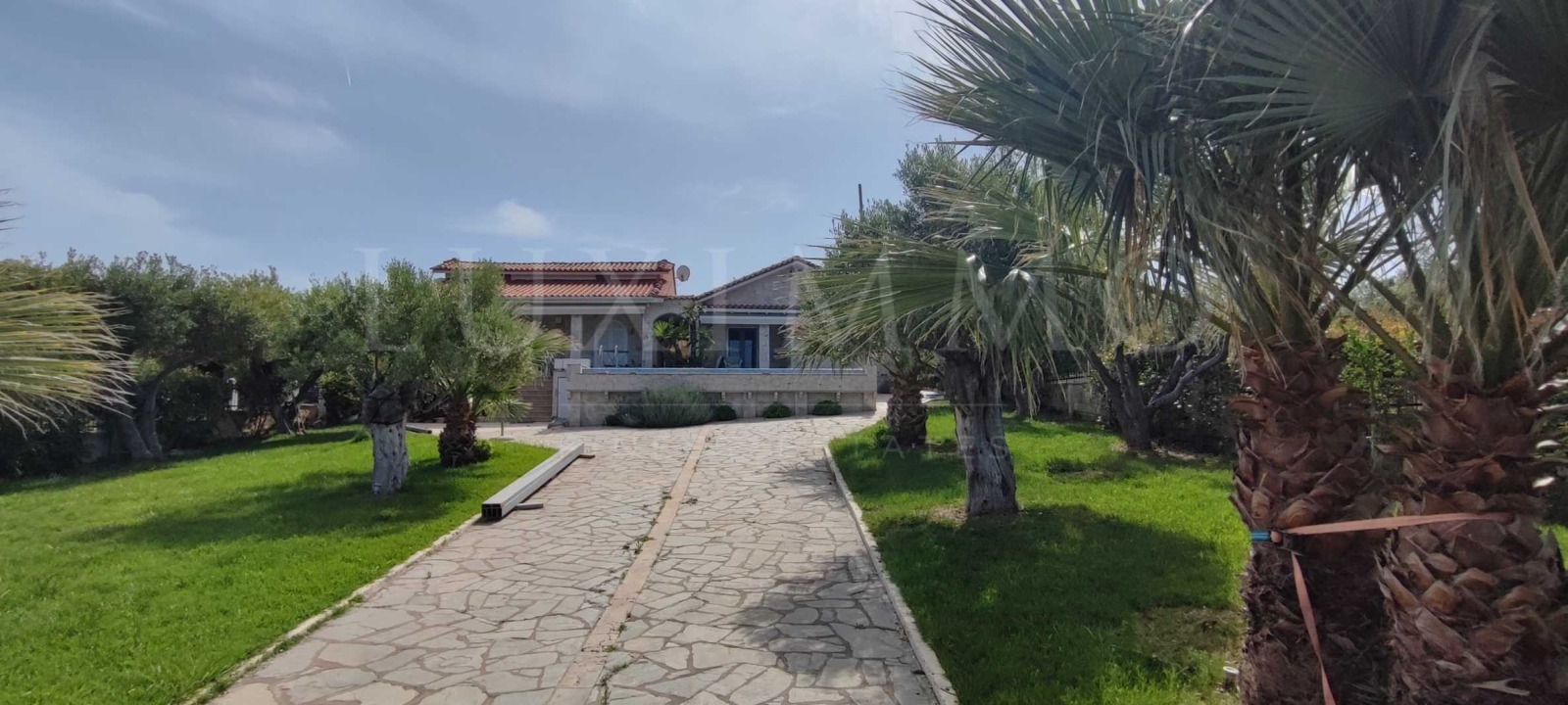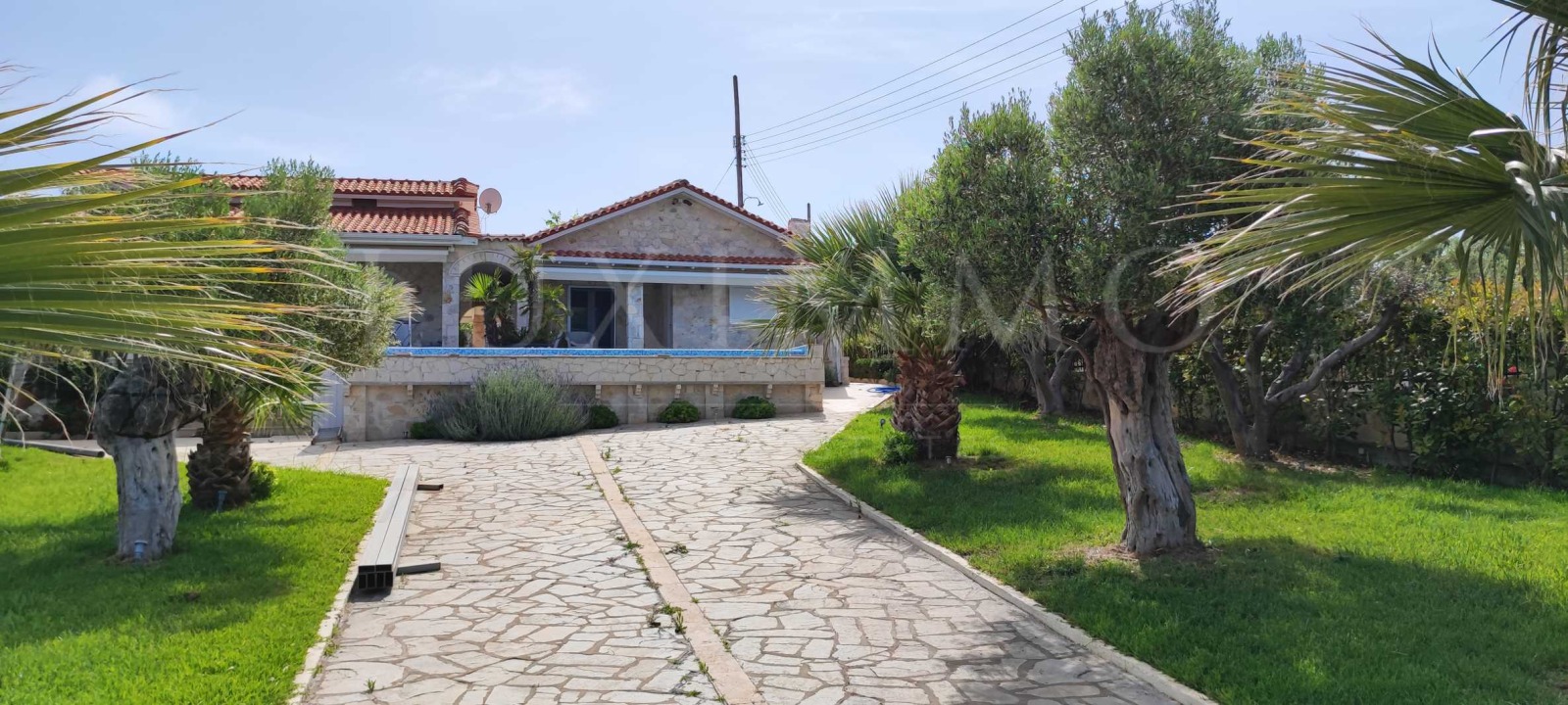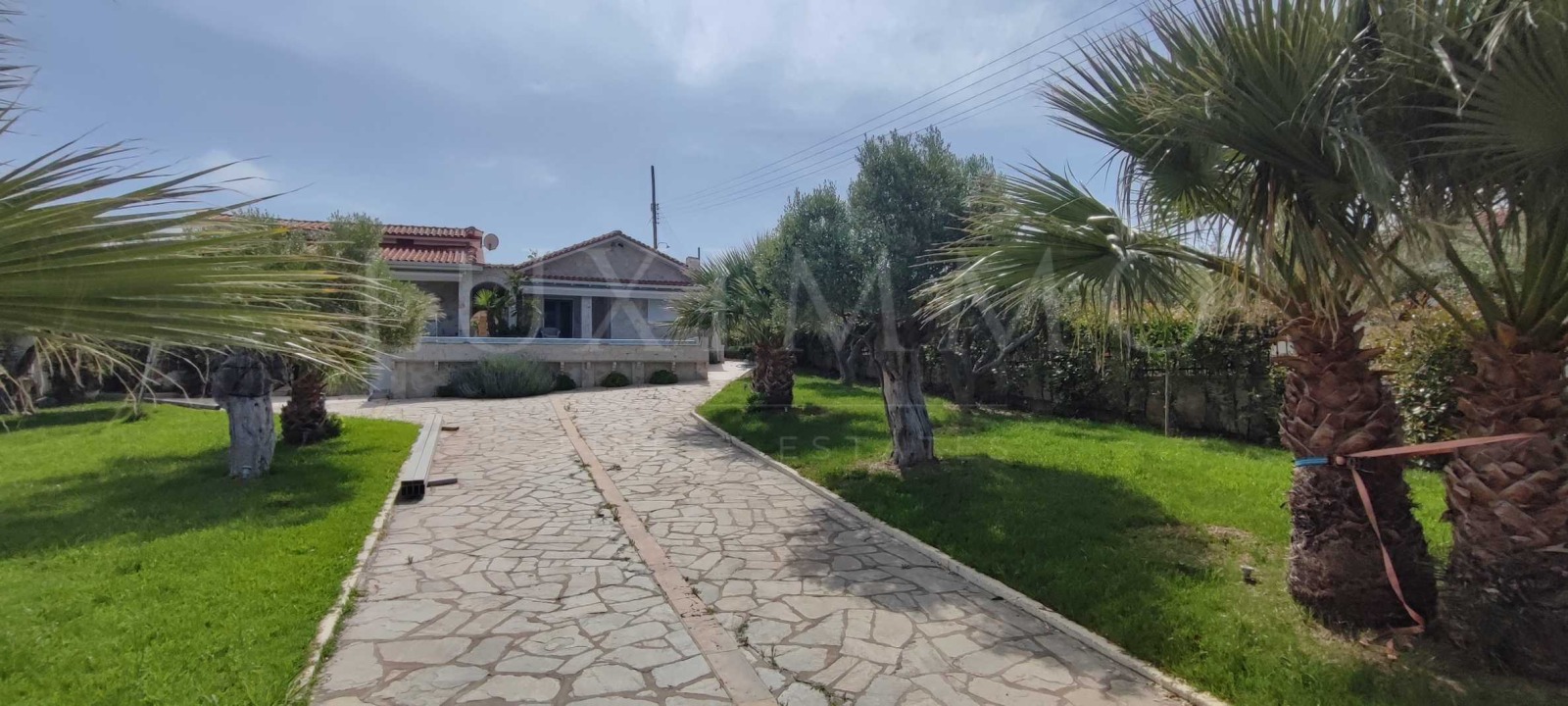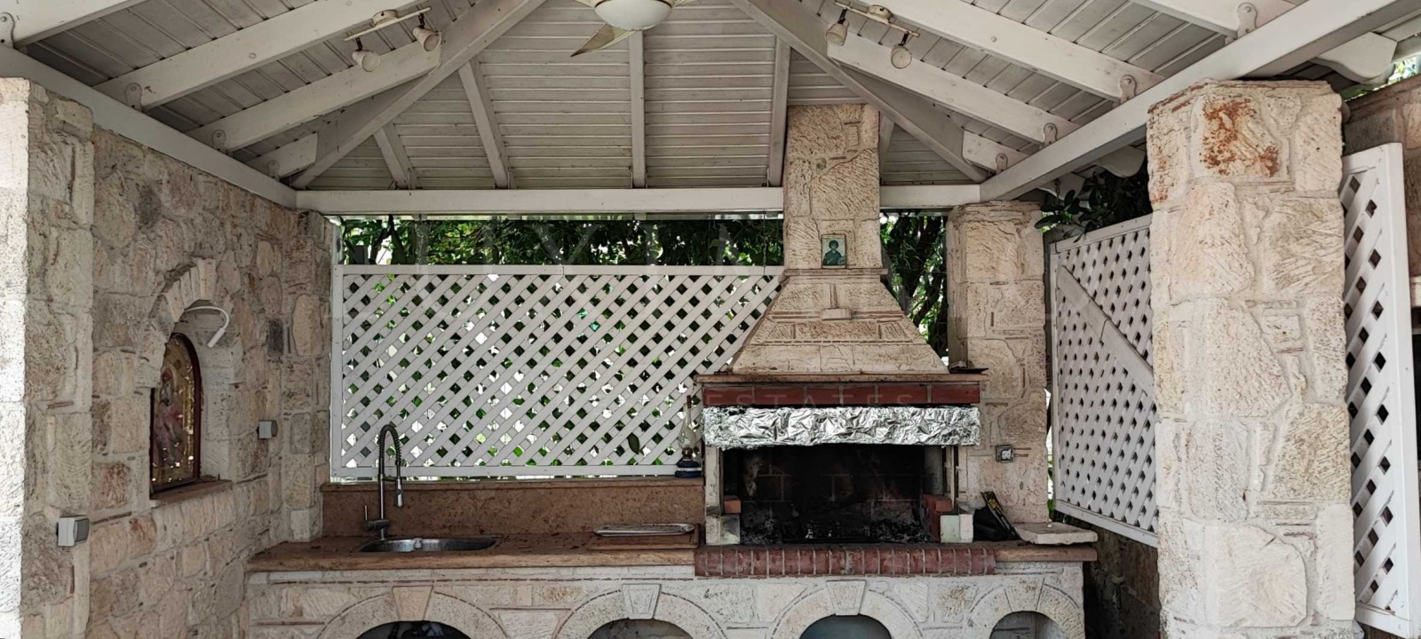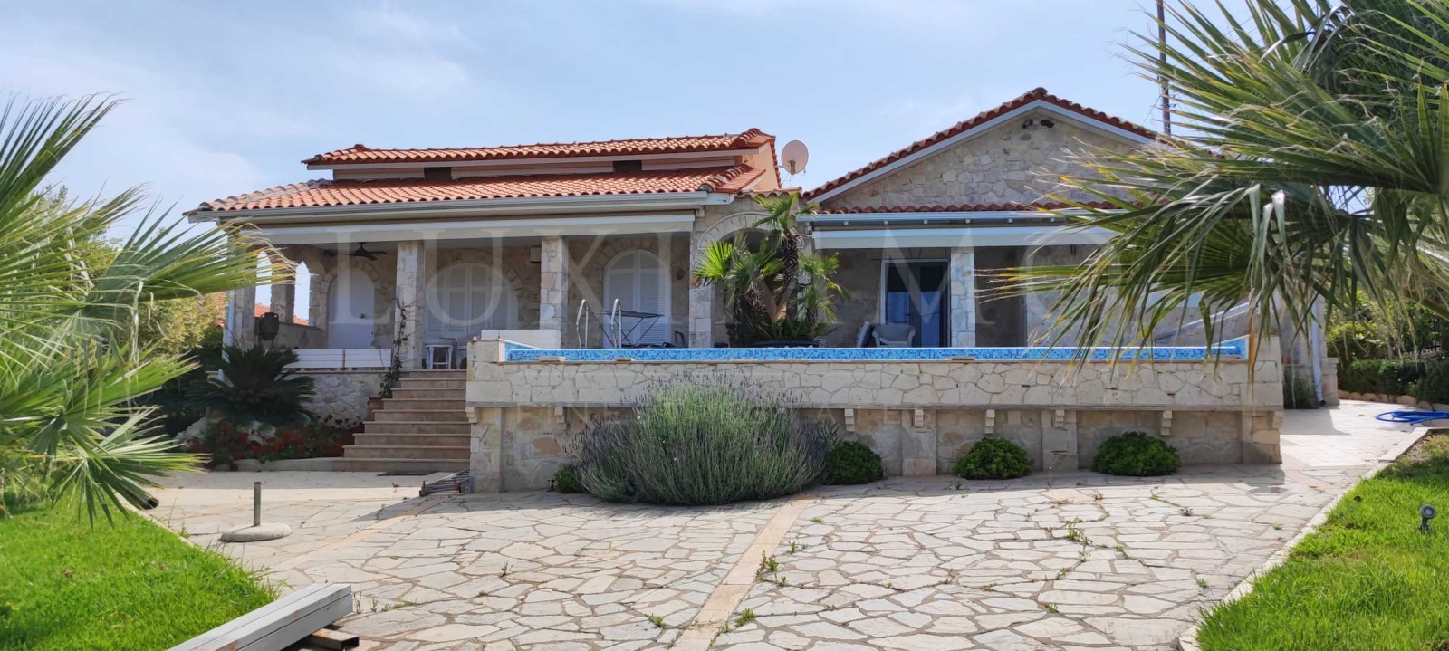 Пред двете основни крила на вилата ще откриете просторна веранда и басейн с размер 25 кв.м. Изключително поддържания двор е осеян с овощни дръвчета, палми, рози, както и столетни маслинови дървета.