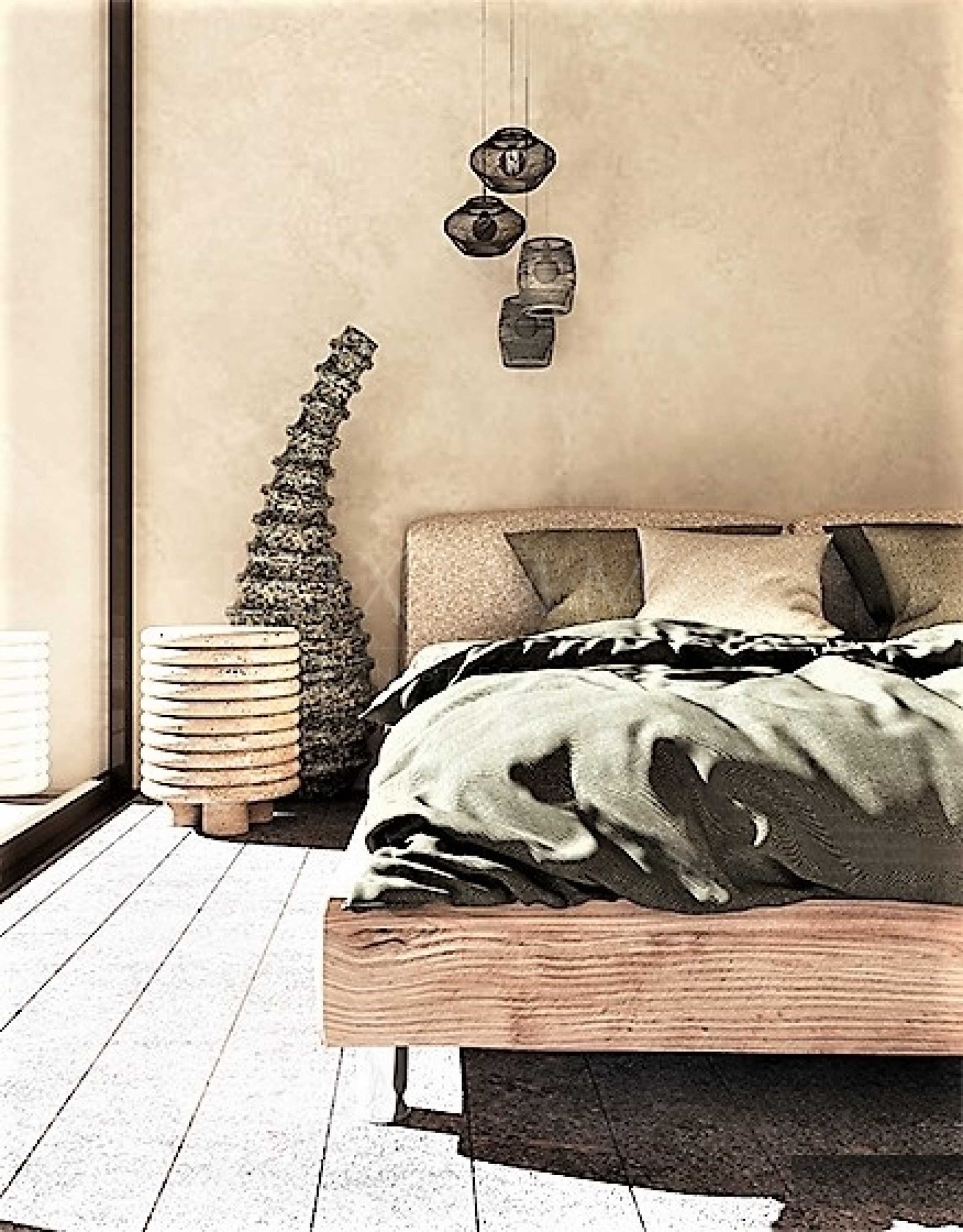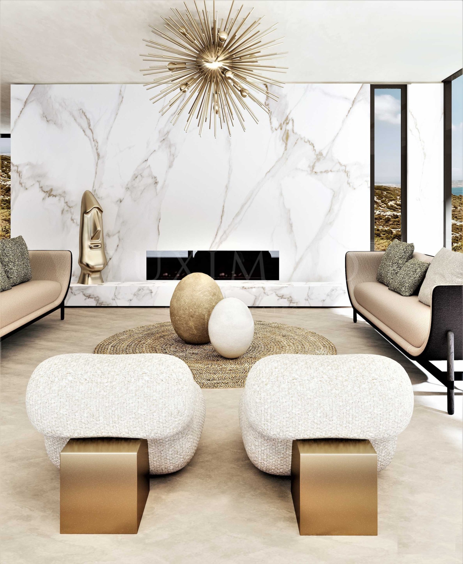 Центърът на композицията е скулптурата Gaia,яйцето, което представлява началото на всичко. Проектът има вдъхновена от природата палитра, материалите са вкоренени в традиция, патинирана мед,