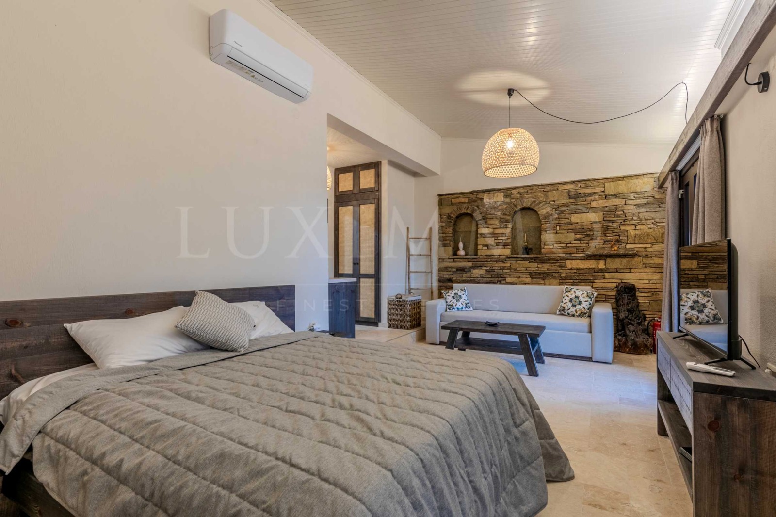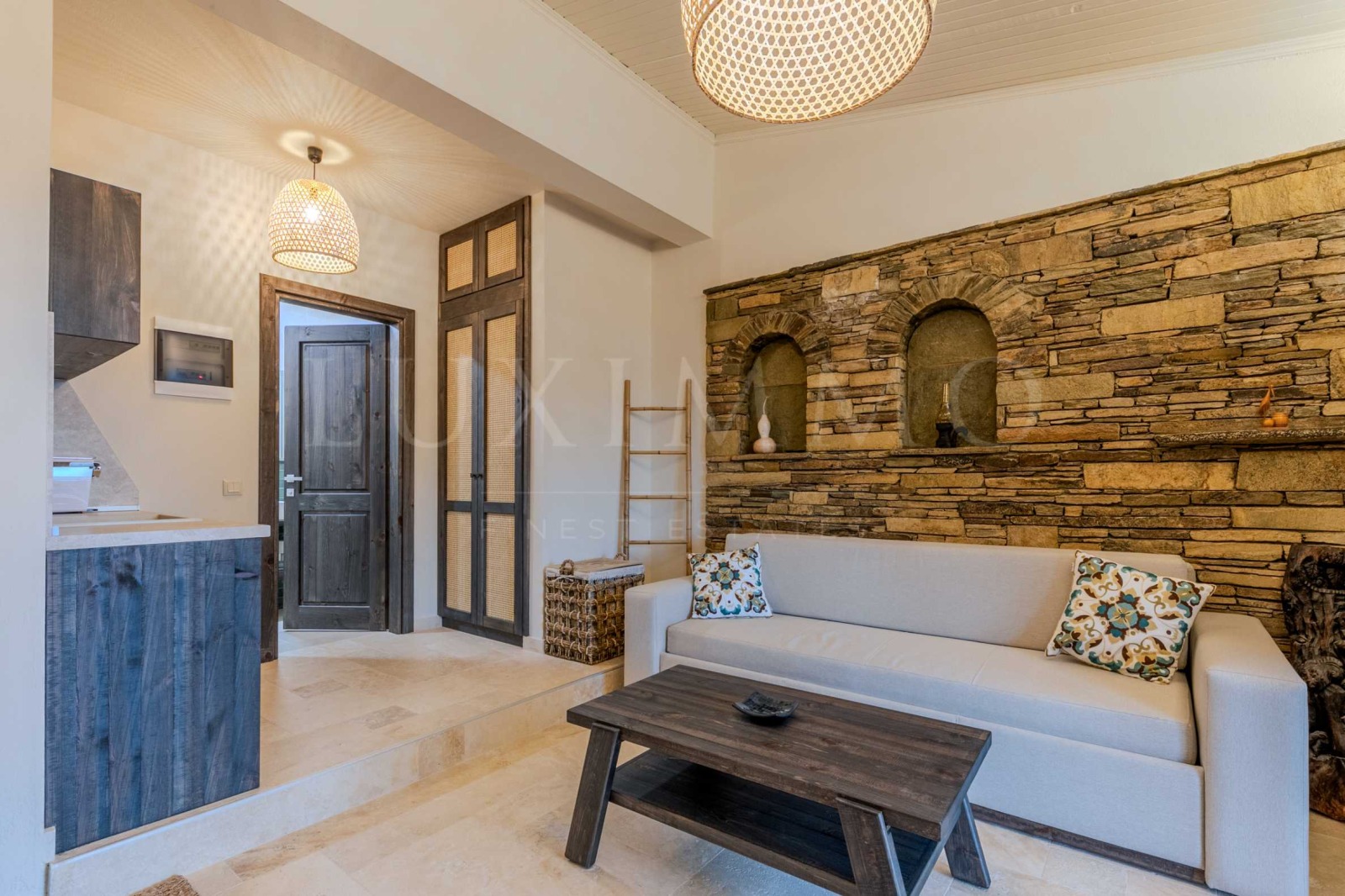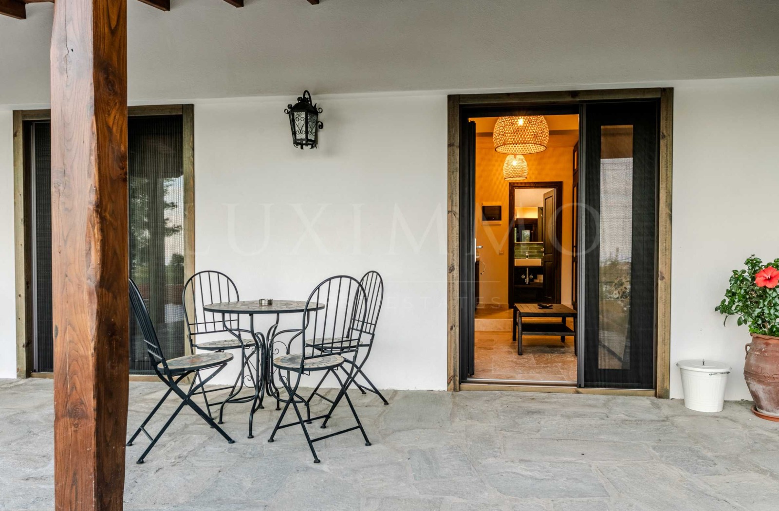 Величествената, изцяло реновирана вила се извисява над кристалночистите води на Егейско море и предлага зашеметяващи изгледи, и пейзажи простиращи се над о-в Диапорос до свещената планина на Атон/Света Гора.