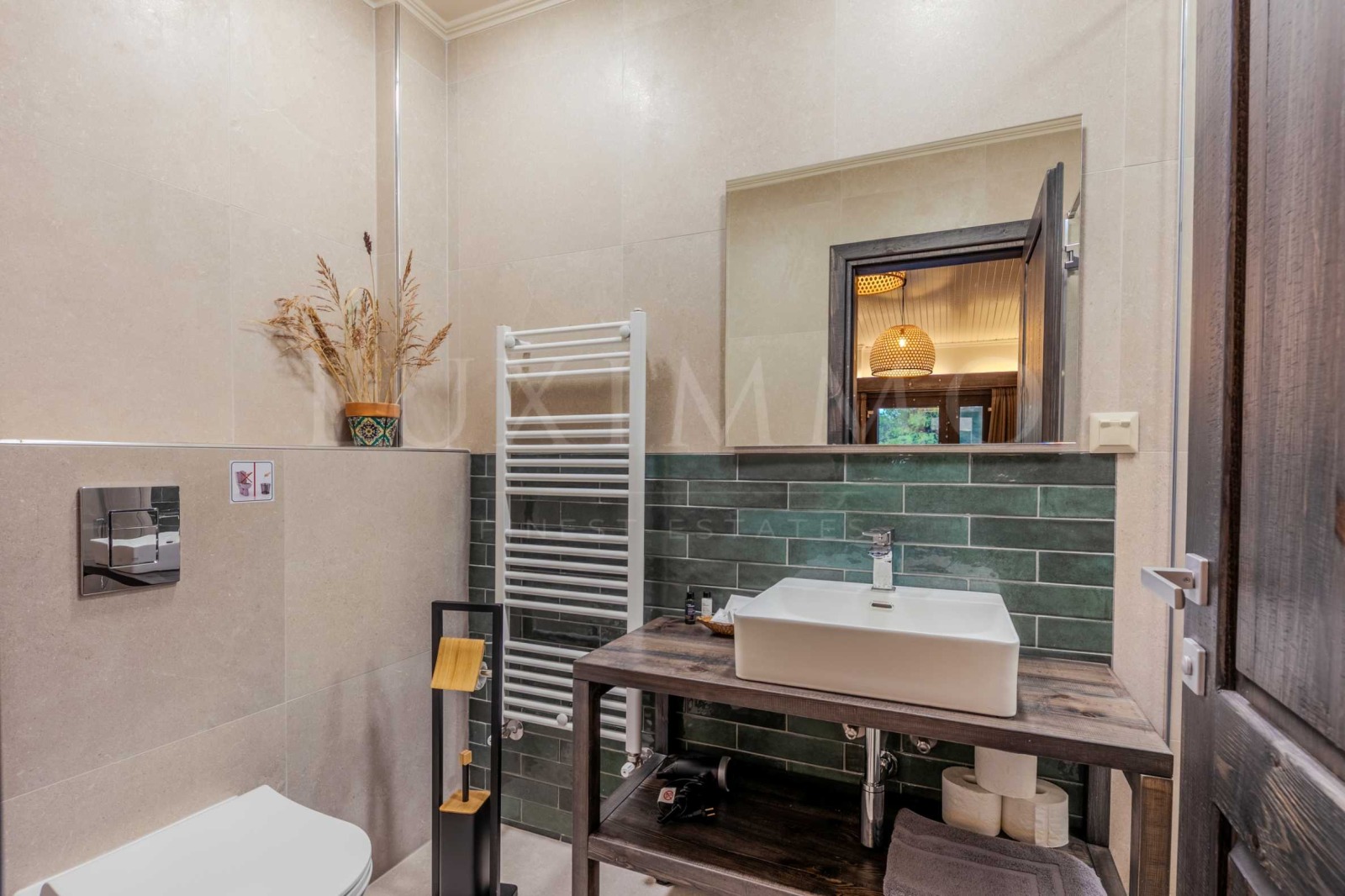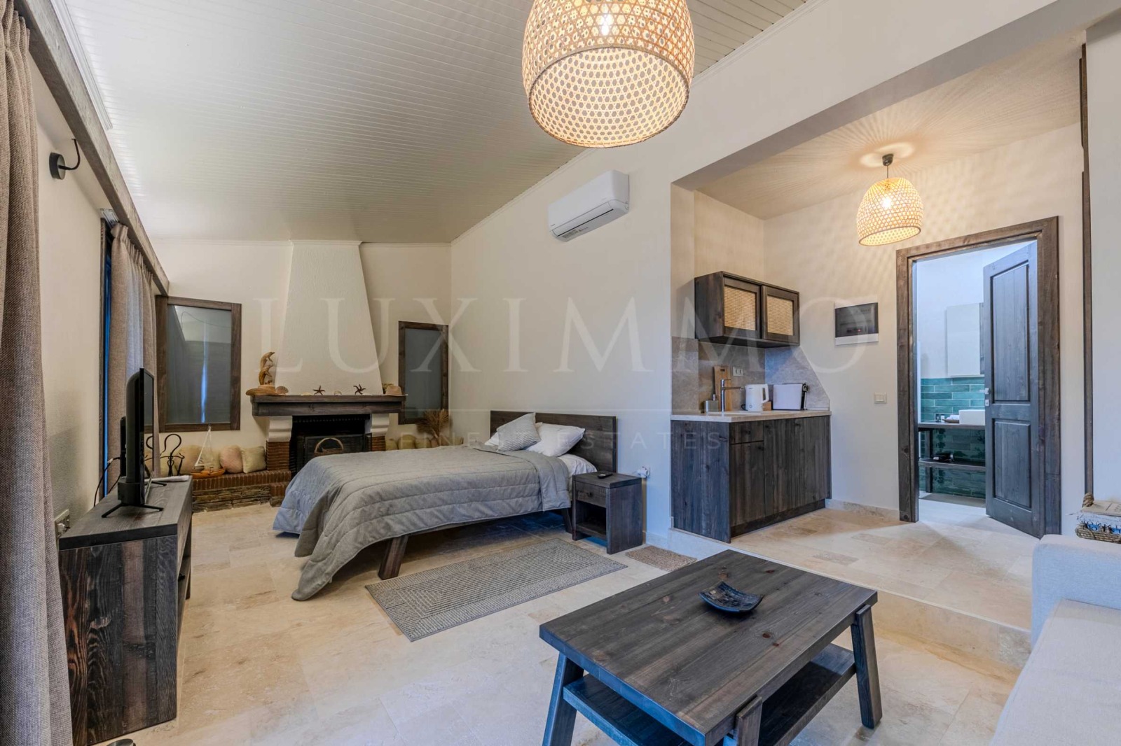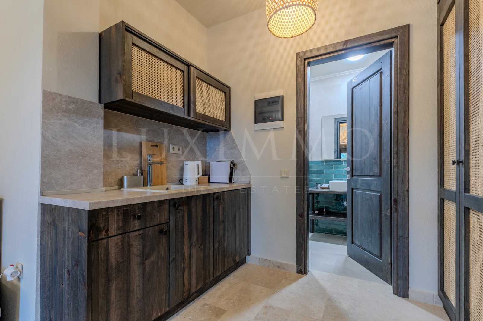Постройката от 300 кв.м е функционално разделена на 5 самостоятелни апартамента, всеки един разполага със собствена дневна, спалня, баня с тоалетна, също и с кухненски бокс, паралено има възможност за обенияване на апартаментите на 1-во ниво.