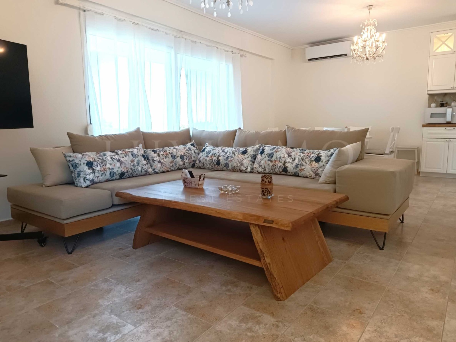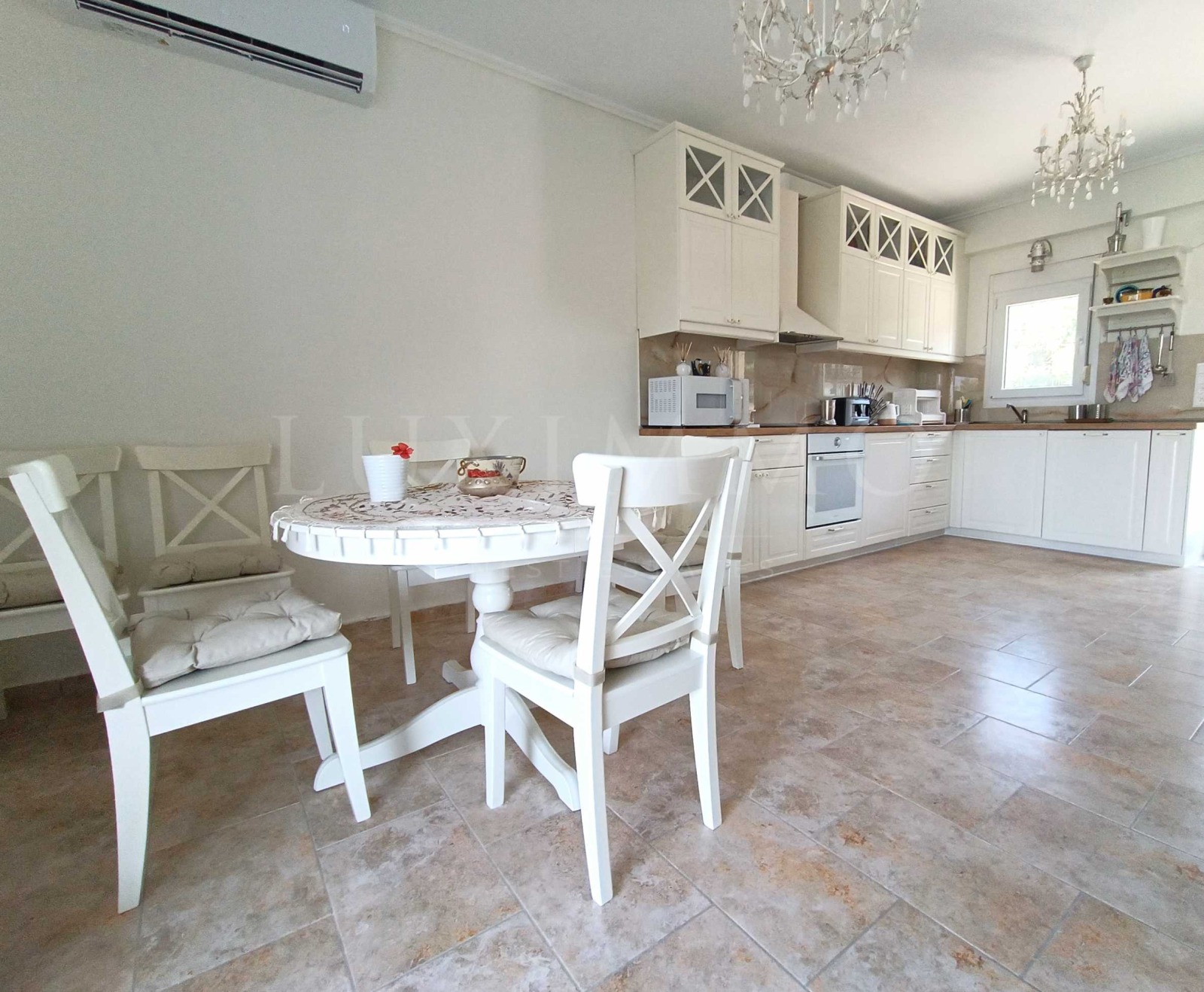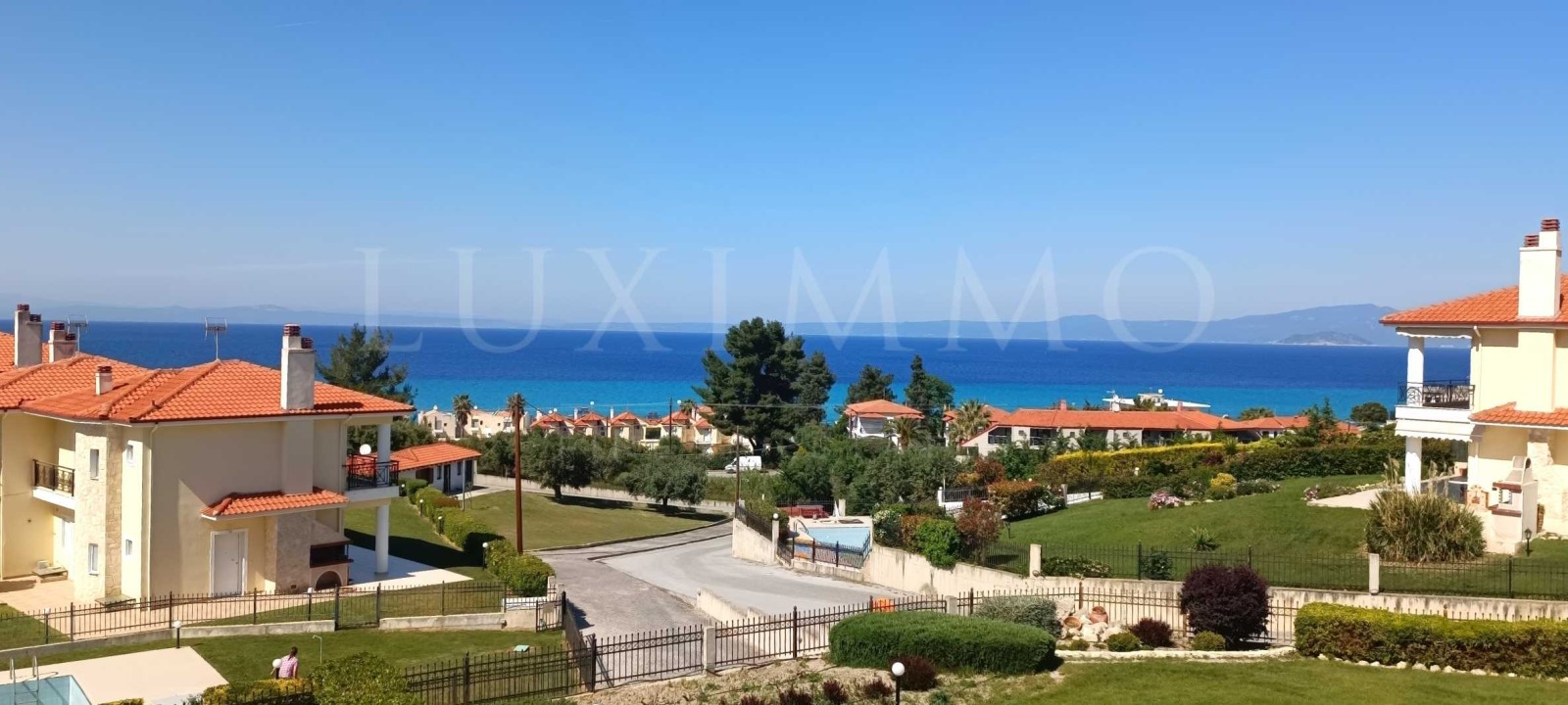 Имотът е част от затворен комплекс и се отличава с високо качество на строителство, изключително подържани общи части, обзавеждане със стил и финес и най-вече с безпирния и зашеметяващ изглед към кристално чистите, тюркоазените води на Егейско море.