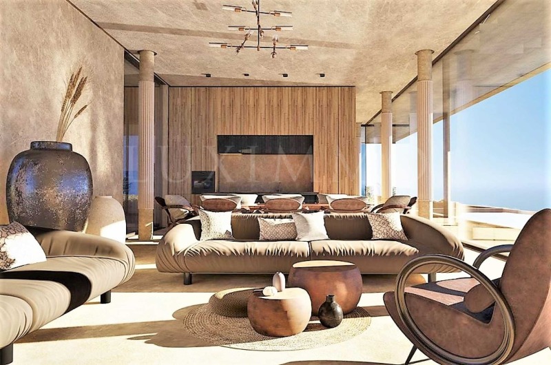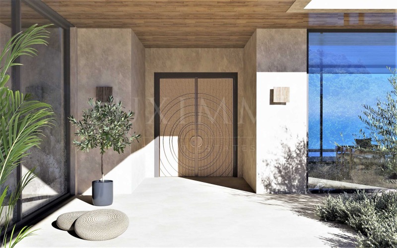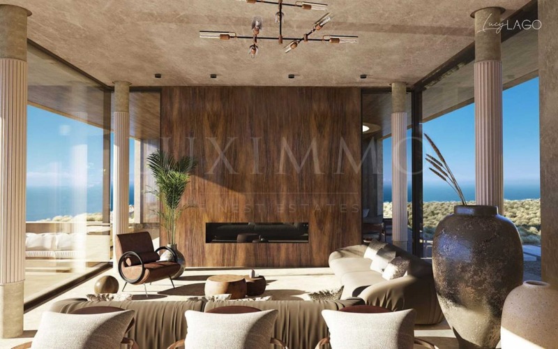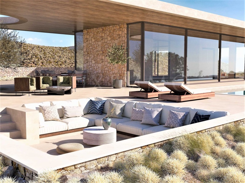 мрамор с цвят на ванилов крем и местен камък правят вилата част от пейзаж, създавайки хармоничен диалог между природата и архитектура.