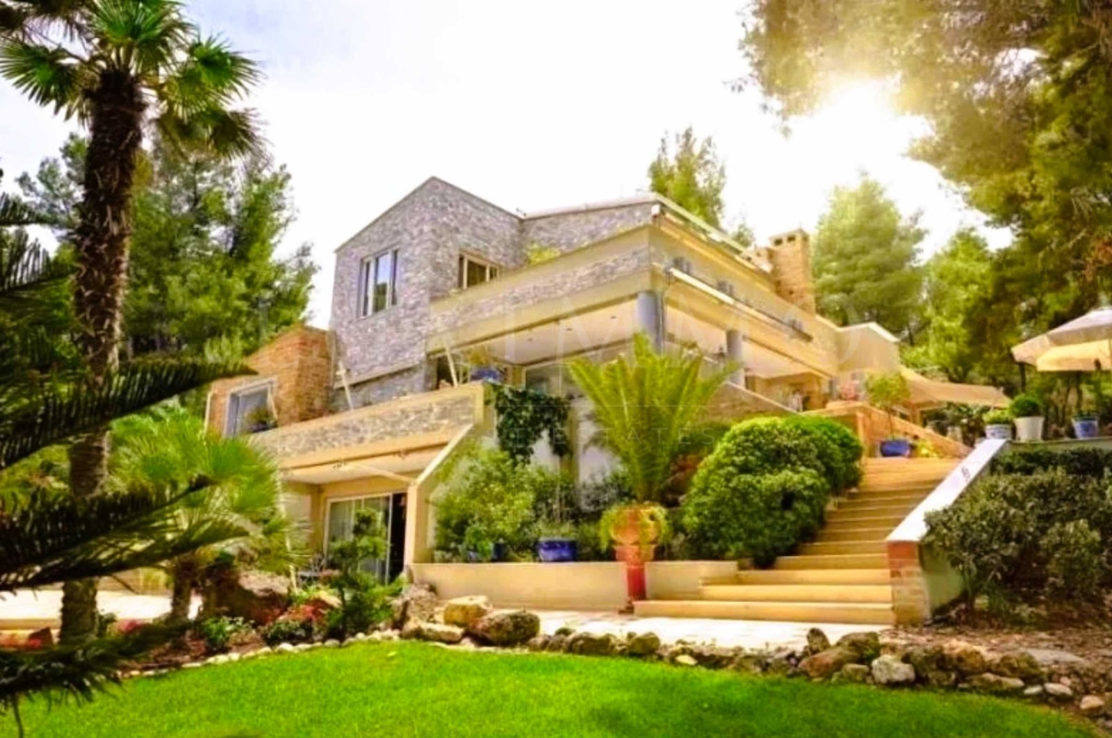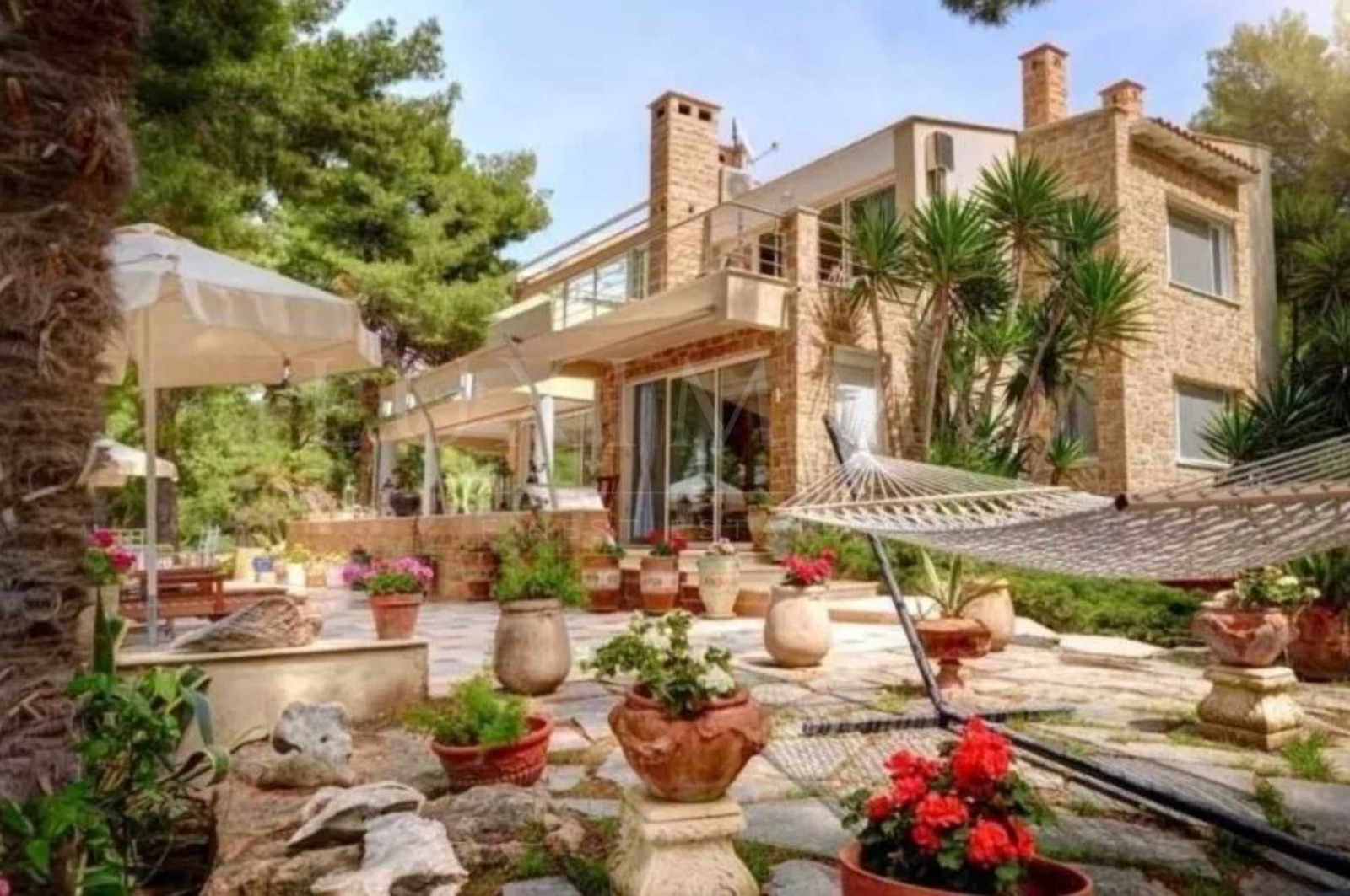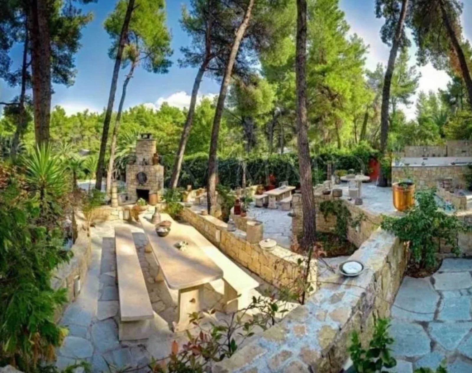 Резиденцията се състои от общо 1000 кв.м РЗП жилищнии площи, основна вила и допълнителни постройки за гости, и помощен персонал , разположени на 18 декара перфектно подържани частна