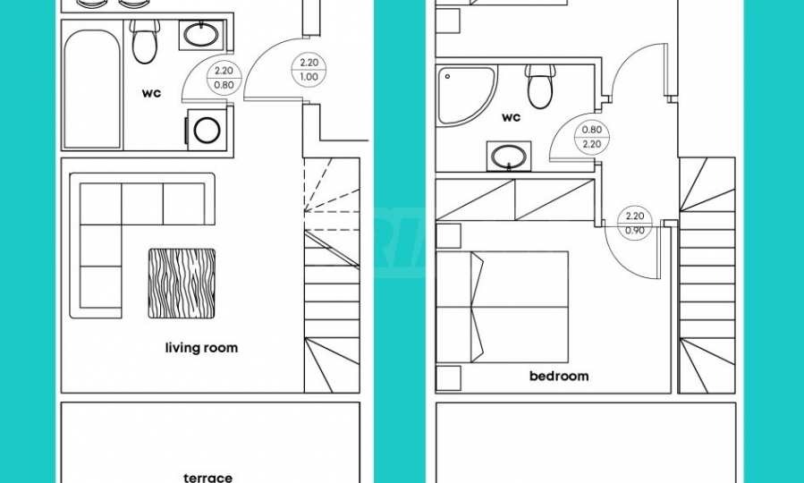 На първо ниво (партер) са разположени двустайни апартаменти, а на второ и трето ниво са разположени тристайни апартаменти тип мезонет.