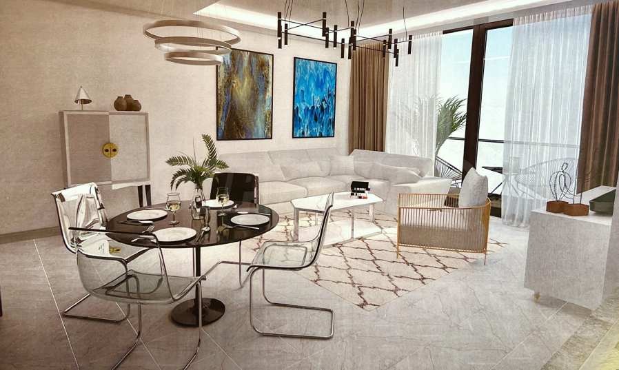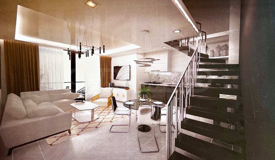 Представеният апартамент е разположен на 2-ри и 3-ти етаж и е с обща площ 92 кв.м удобно разпределена във всекидневна с кухненска част, две спални и две бани с тоалетна. Апартаментът се предава завършен до ключ , с входни и интериорни врати, преинсталация за климатици, и оборудвана баня с тоалетна.