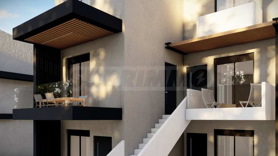 Разпределението включва хол с обособено кухненско пространство, спалня и баня с тоалетна на едното ниво и родителска спалня със собствена баня и тераса на второто ниво.Апартаментът се издава завършен 'до ключ', с поставени входна и интериорни врати, подови настилки, вградени кухненски шкафове и оборудвана баня.