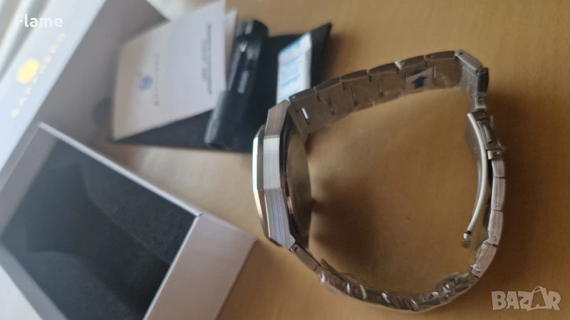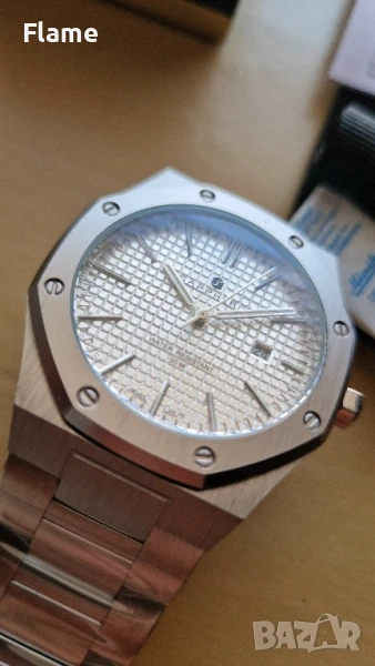 Мъжки часовник наподобява AP Royal Oak. Чисто нов е с кутия и гаранция. Никога не е слаган . Водоустойчив на 30 метра Изцяло изработен от неръждаема стомана. Верижката се регулира.Касата е 42 мм , дебелината е 11мм. Подходящ е както за спортно облекло така и официално.