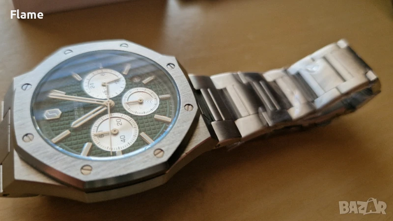 Мъжки часовник наподобява AP Royal Oak. Чисто нов е с кутия и гаранция. Никога не е слаган . Водоустойчив на 30 метра Изцяло изработен от неръждаема стомана. Верижката се регулира.Касата е 42 мм , дебелината е 11мм. Подходящ е както за спортно облекло така и официално.