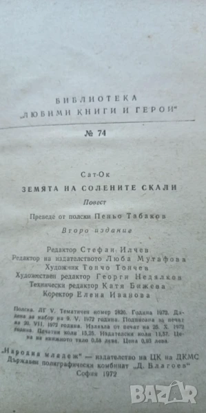 „Земята на солените скали“ Сат-ок посвещава на своето детство. Макар тази повест да е автобиографична, тя е едно художествено обобщение на живота и борбите на племето шеванези, почти единственото свободно индианско племе, готово да пожертвува живота си, но да остане на свобода, която, според думите на автора към младите читатели, „то има толкова малко, а тъй много му е необходима“.