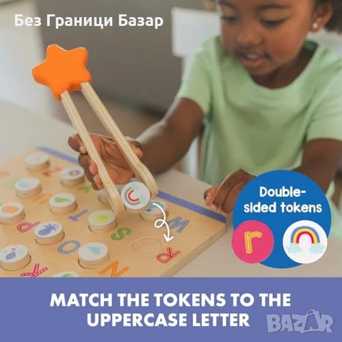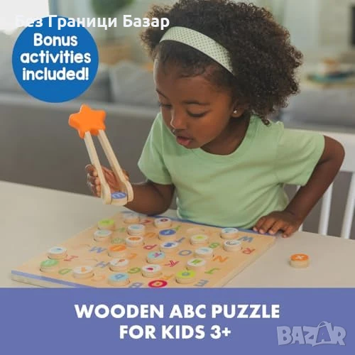 Дървен пъзел с 26 двустранни жетона за всяка буква от азбуката
