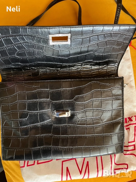 Miss Sixty- змийски принт лачена чанта, удобна и като портмоне. Размери 34/22/3см, има и дълга дръжка-52см обща дължина, две отделения и джоб с цип. Не е употребявана, съхранявана в противопрахова торбичка