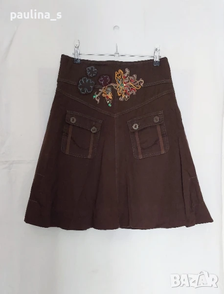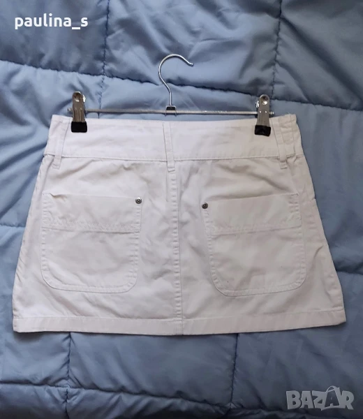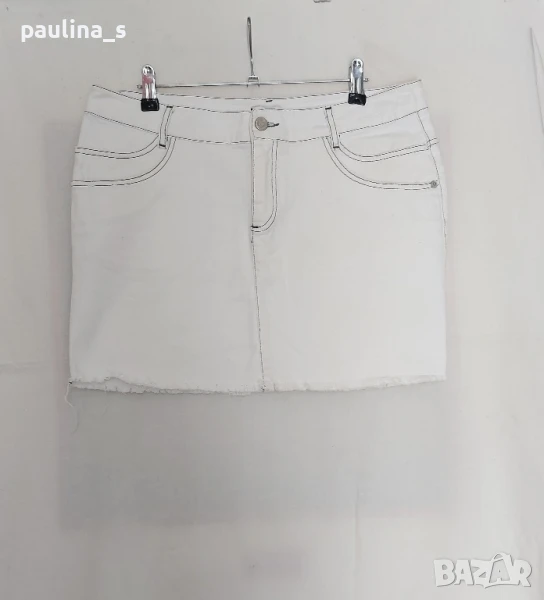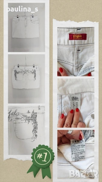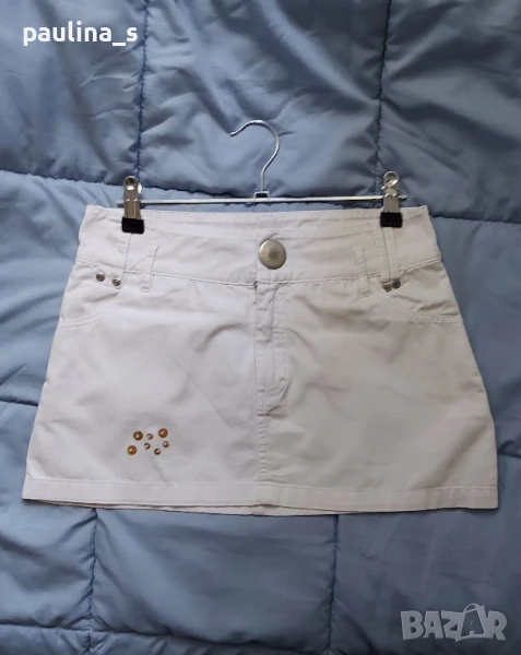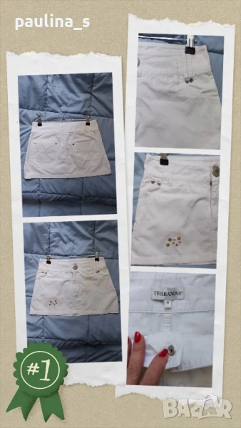3️⃣. Колаж / Колаж / S / M - "Terranova". Цената е крайна 19,99лв / 10 евро. Бяла дънкова пола. Моделът е 5 pocket Denim, със силует Камбанка. Гайките са асиметрични отпред и има допълнителни гайки за колан за ханш. Декорациите са ръчна изработка от мен - полихромни пайети и мъниста от перли, стеснявана е също и така отговаря на S / М. Отзад джобовете са коси.