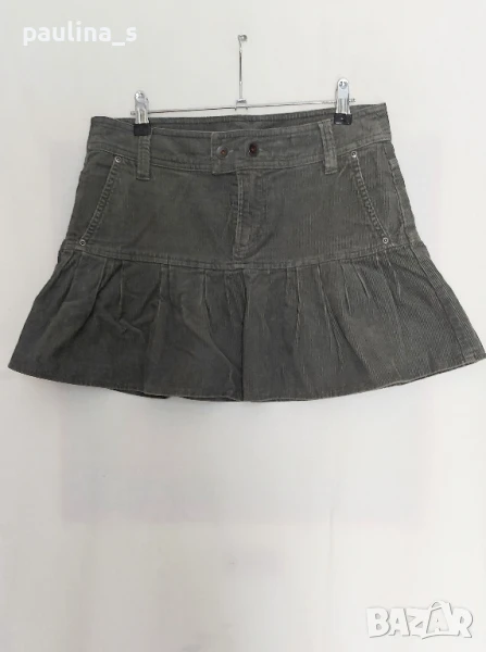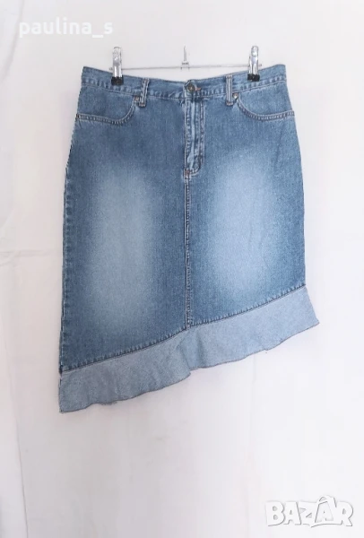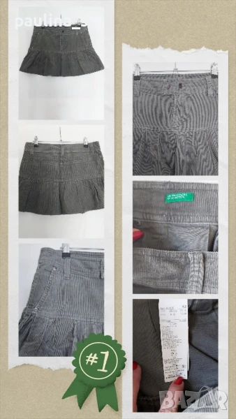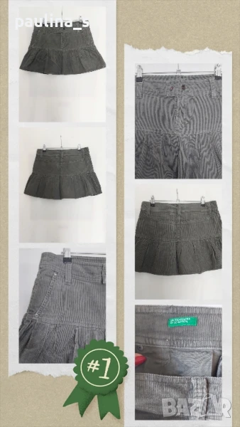 4️⃣. Колаж / M / L - "Benetton". Цената е крайна 19,99лв / 10 евро. Джинсова мини пола с волан и коси джобове отпред. Отзад няма джобове. Коланът е с двойно закопчаване и прихлупване, оксидирани брандирани копчета и кабзи. Като нова, без дефекти и етикет.