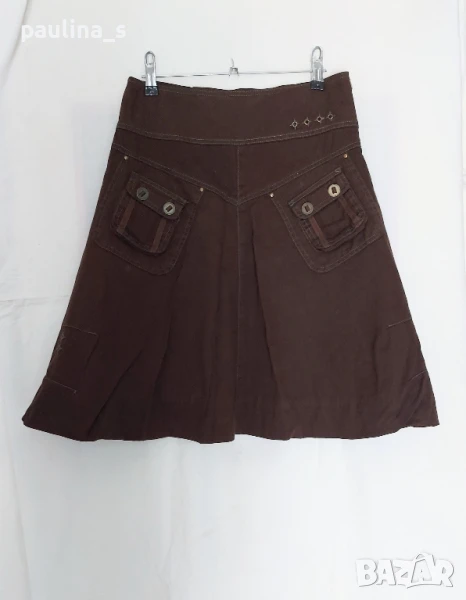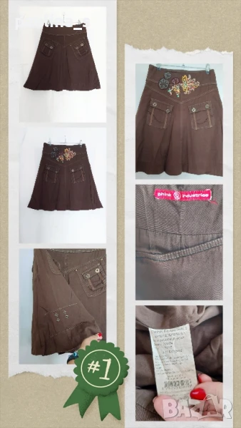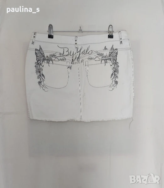 5️⃣. Колаж / L / XL - "Buffalo" by David Bitton. Една бройка. Цената е крайна 24,99лв / 12,5 евро. Дизайнерска дънкова пола рисувани щампи отзад. Платът е плътен от от леко до средно еластичен, с графитени маркировъчни тегели. Моделът е 5 pocket denim отпред с двойни джобове, а отзад декориран с апликации и блестящи камъни, някои липсват, съобразена цена! Долу е без подгъв - на конци с предпазен от продължаващо изнищване тегел. Катонова, без дефекти и етикет.