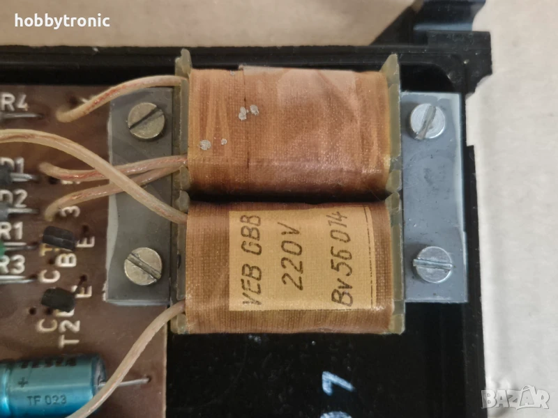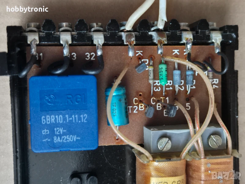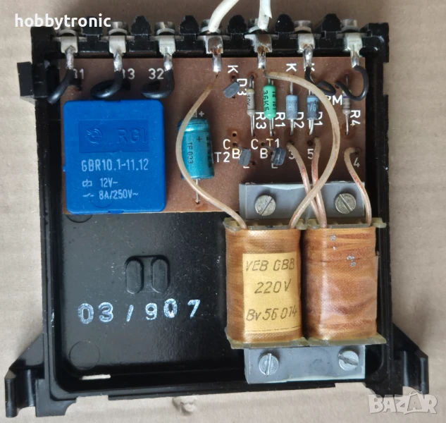 Съдържа миниатюрен трансформатор 220V-> 2x11V, реле 12V 8A с превключващ контакт, управление.
