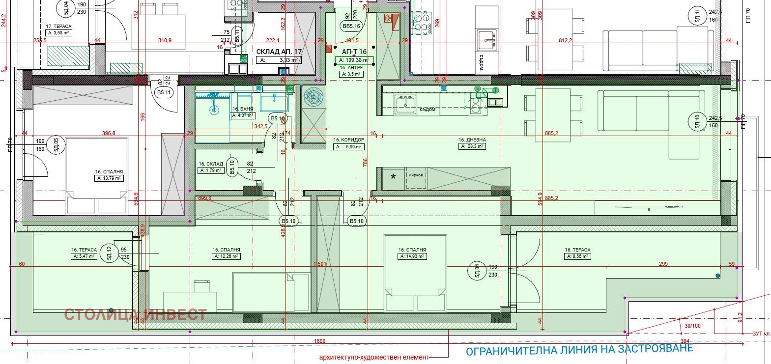 Агенция Столица Инвест предлага на Вашето внимание ново строителство 3- стаен апартамент в кв. Здравец Изток на град Русе. Имотът е с площ 125 кв.м. и е ситуиран на ет. 5 от общо 5 с асансьор. Апартаментът се състои от коридор, всекидневна, две спални, 2 големи тераси, склад и баня с тоалетна. Изложението е изток-запад. Жилището се предлага завършено по БДС. Сградата ще бъде завършена до края на 2025г. Намира се в близост до училище, магазини и главни пътни артерии.
