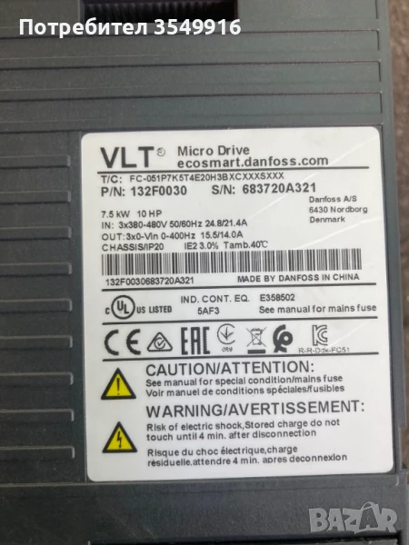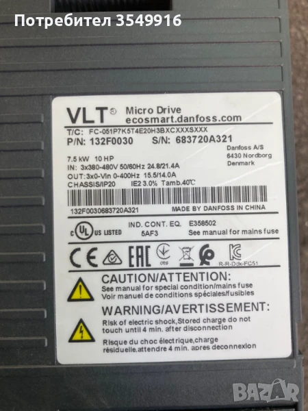 Честорен регулатор Danfoss 7,5 KW Модел FC 051P7K5T4E20Н3BXC Вход 3PH 380/480V +/- 10% 50/60Hz 24.8/21,4A Изход 3PH 380/480V 0/400Hz 15.5/14А Перфектно състояние.