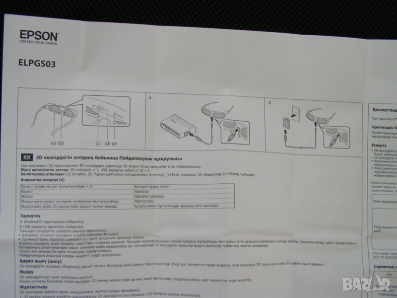 Предлагам нов комплект в оригиналната си опаковка Epson ELPGS03 RF 3D очила. Кристално чисто 3D забавление — позволява лесно гледане на 3D филми и игри. Елегантен, лек дизайн — удобно гледане на 3D съдържание, забележително покритие. Лесно регулируеми очилата предлагат идеално прилягане и комфорт при използване. Конструкцията им позволява да пасват върху повечето модели очила с диоптър. Съвместимост — за употреба с RF 3D проектори, включително Power Lite Home Cinemas 2000, 2030, 3020, 3020e, 5020UB, 5020UBe, 5030UB, 5030UBe и 750HD; Pro Cinemas 4030, 6020UB и 6030UB; и проектор Power Lite W16. Презареждаеми с издържливост след пълно зареждане до 40 часа. Имат и опция 3 минутно бързо зареждане. 3 часа непрекъсната работа при 3 минути бързо зареждане за удължено функциониране. Автоматичното изключване позволява да се съхрани живота на батерията.