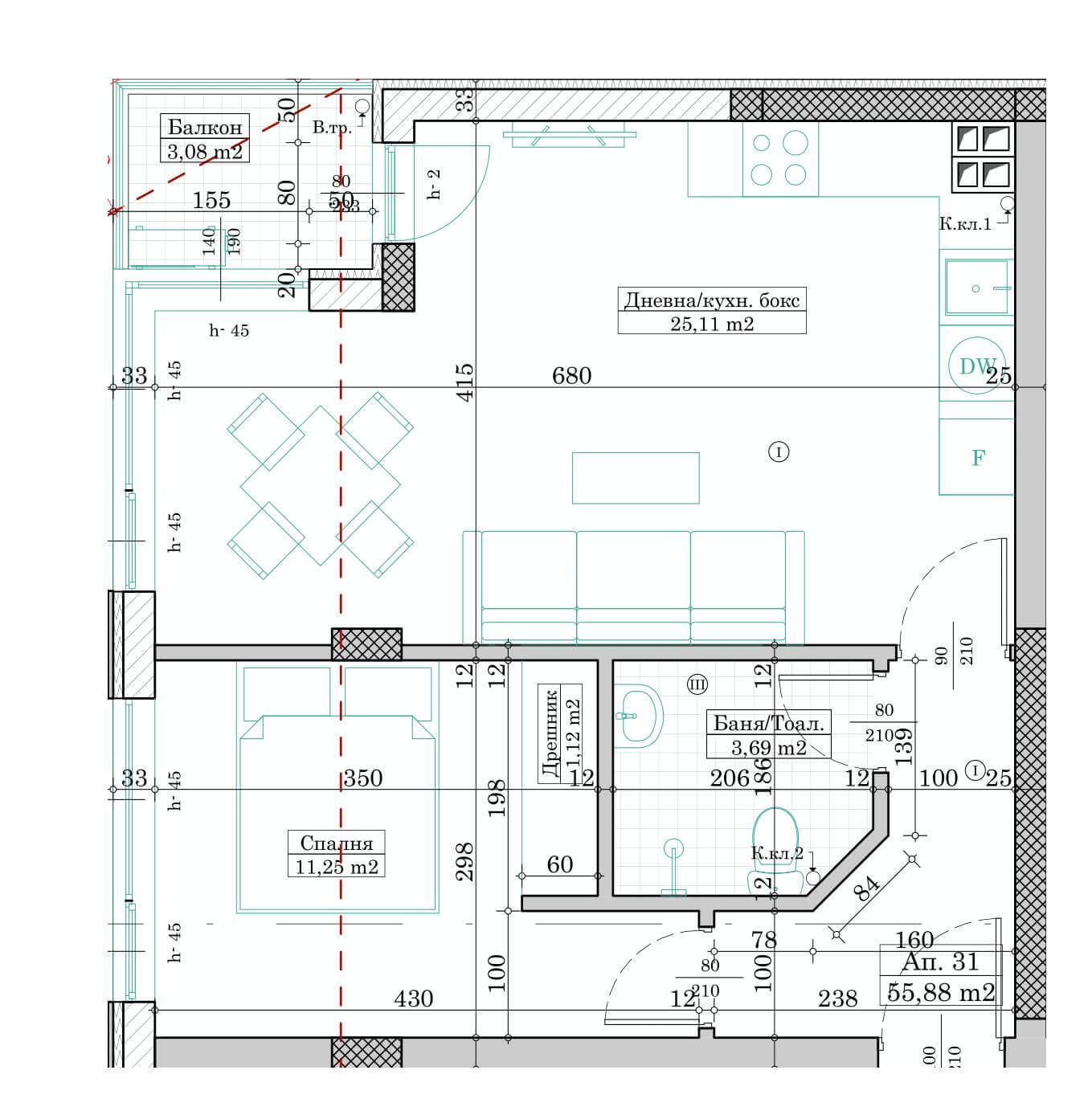 На чиста площ от 55,88кв.м. са разположени дневен тракт с кухненска част, спалня, баня с тоалетна, коридор, тераса.