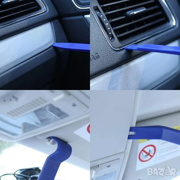 Този комплект от 11 различни пластмасови инструмента е вашият незаменим помощник за лесно, безопасно и бездраско разглобяване на автомобилен интериор и облицовки. Специално разработен, за да не поврежда чувствителните повърхности, той напълно замества случайните отвъртачи и ножове, които често оставят перманентни вдлъбнатини или белези. Идеален е за работа с пластмасовите клипси, крепежни елементи и тапицерия, които държат панели на врати, корнизи, табла и лайсни на прозорци.