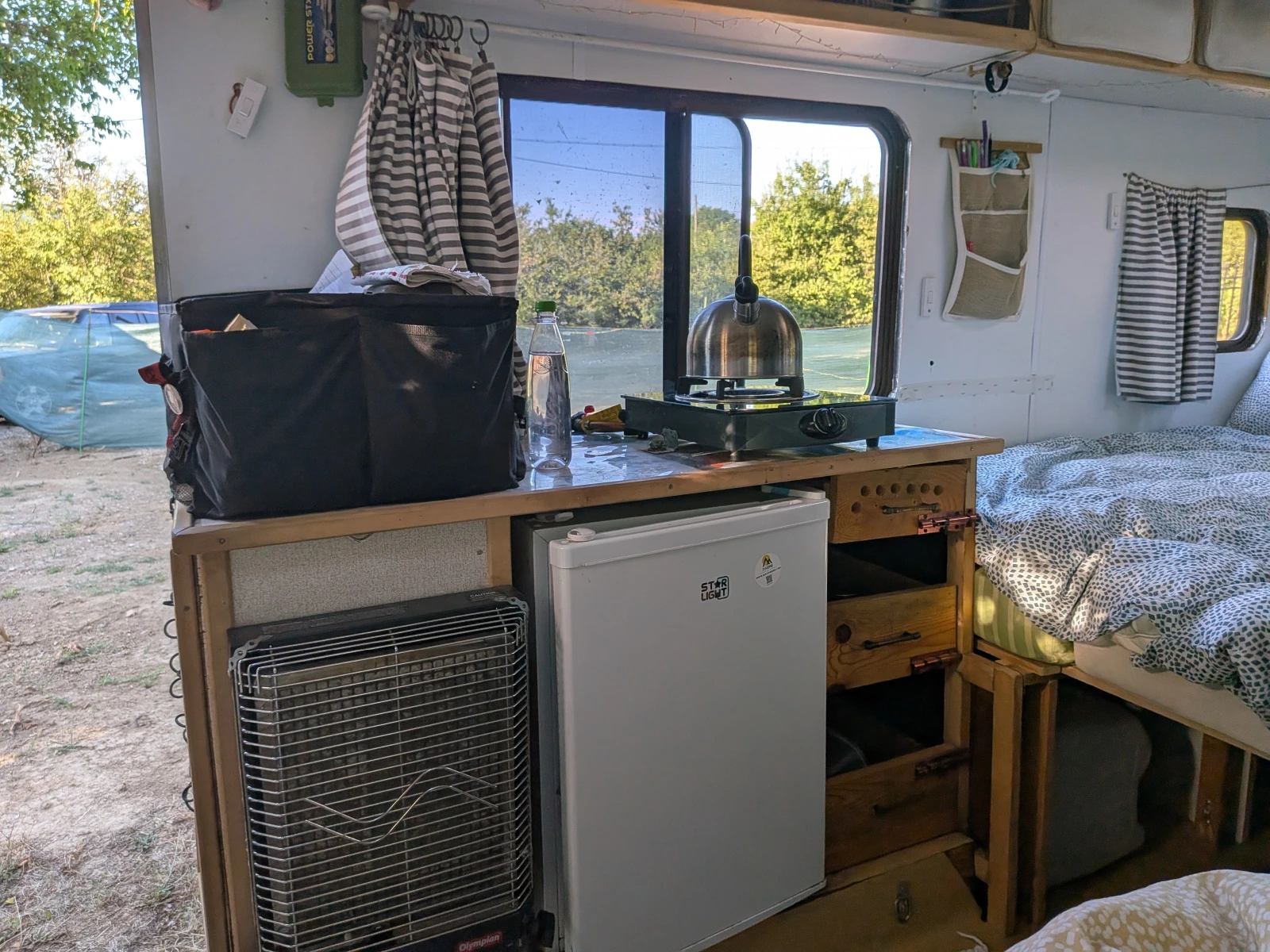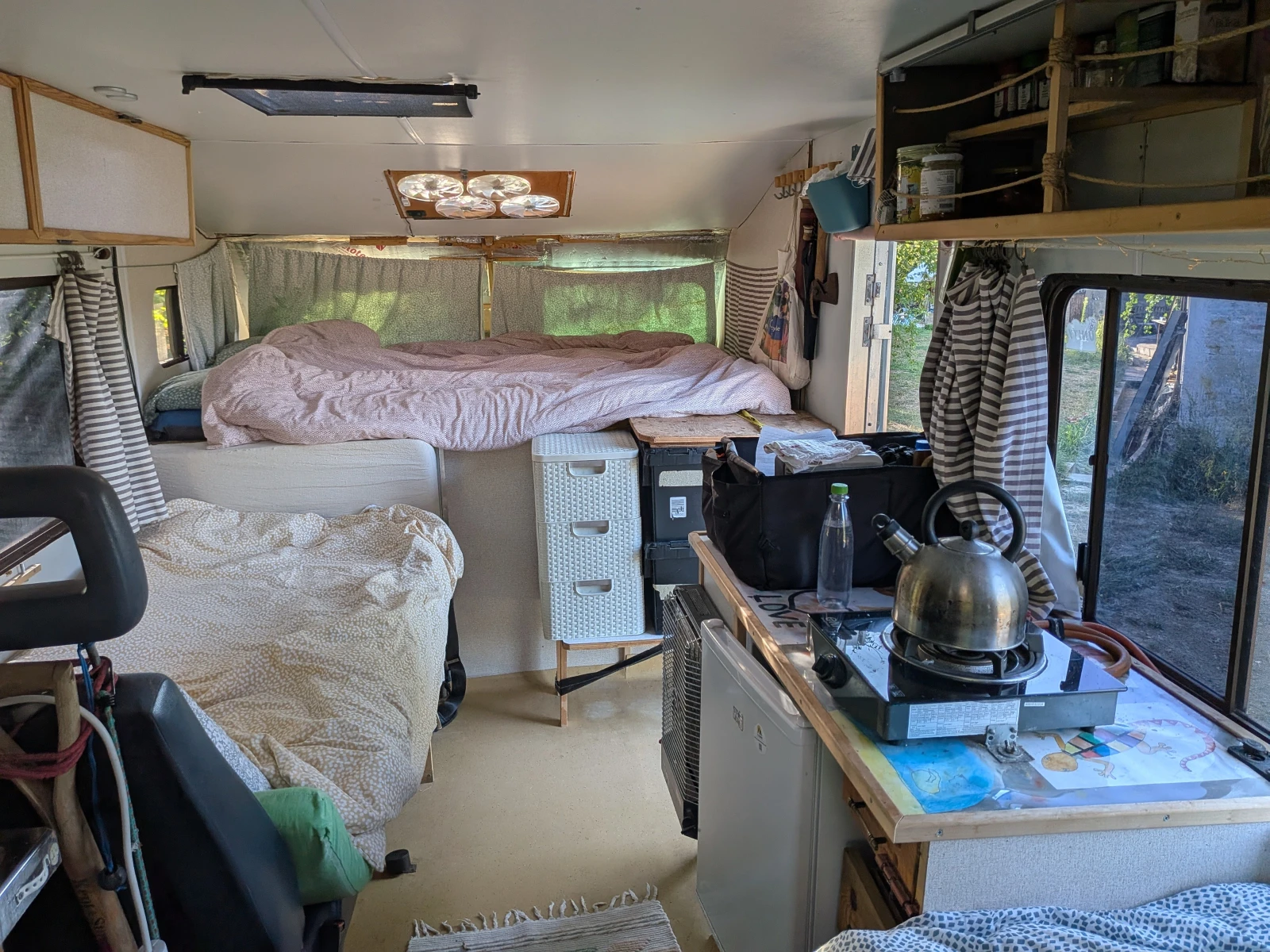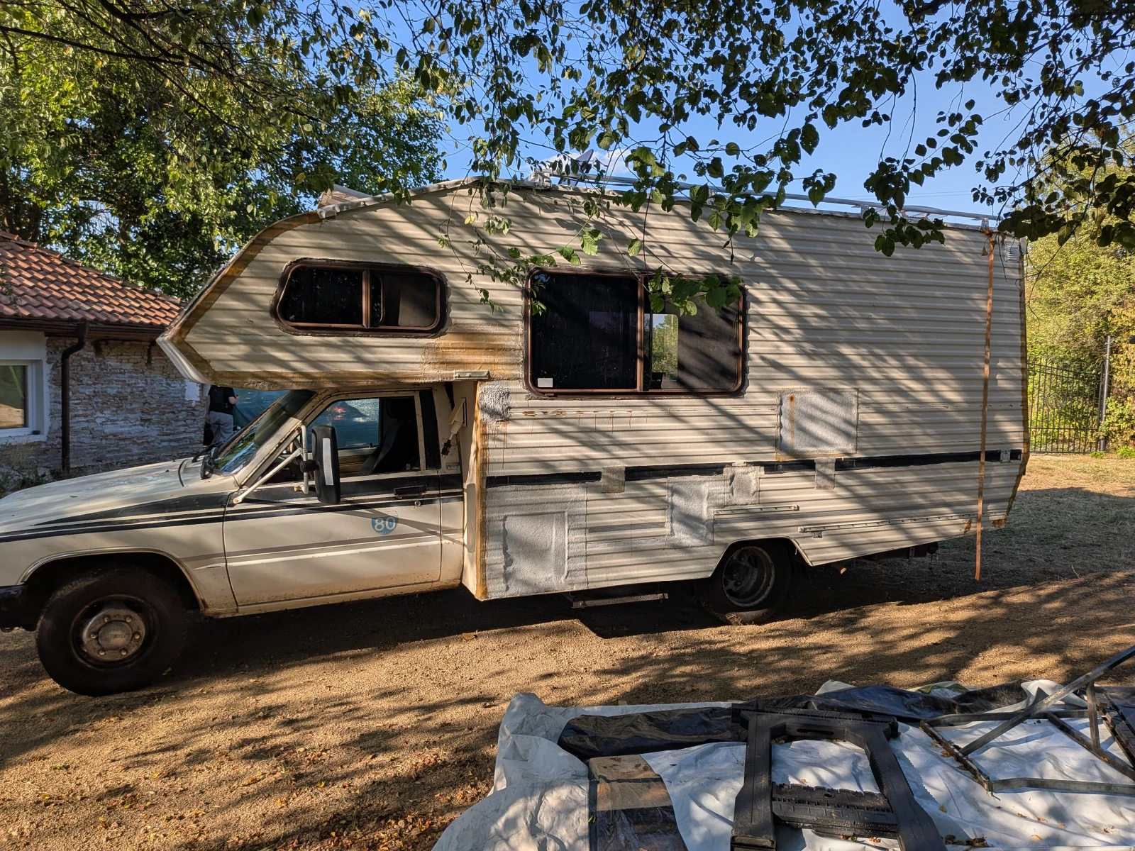 Снимки и видео тук https: //photos. app. goo. gl/41xEGvipMjuxEEct8 Кемпера е уникален. Базата е на Toyota 4Runner , набор 1987г. Практически вечен бензинов двигател, с монтирана газова уредба, гори около 20 на сто газ, в сравнение се 15 на сто дизел за еквивалентен клас кемпер. Кемпера е със задно предаване, двойна гума отзад и тежи между 3 и 3. 5 тона в зависимост от багажа. Има голям просвет отдолу и е много проходим трева, кал, пясък - никъде не съм закъсвал. Пак голяма разлика от стандартните кемпери, които като помиришат мокра трева се предават. Отзад има въздушни възглавници които правят голяма разлика за стабилността по завоите и на магистралите. Гумите са в отлично състояние всесезонни, висок клас. Кемпера е изцяло оборудван за offgrid и има проходимостта да стигнете до мечтаните местенца. Релсите на шасито са като за влак нямат изгниване. Автоматик. Камера за задно виждане. Валиден преглед, застраховка, винетка. Малко история Шасито е оригинално произведено в Япония, внесено в САЩ, където е направено на кемпер от многото производители които са ползвали тези шасита за кемпери. 1991г е внесено в Англия. Аз самия го закупих 2015 в Англия и го внесох 2016 в България. Като го закупих практически направих кабината за живеене наново освен последните 2мм фибростъкло направих всичко наново ползвайки висок клас шперплат за кемпери. Покрива го покрих са EPDM гума за покрили 50г живот. Всички ъгли и снадки с епокси. От тогава си го карам и съм направил около 25х км последните 10г. Към днешна дата е на 95109 мили или 153х км. Двигателя мърка като коте. Пали от първо завъртане. Продавам го с голяма мъка, но последните 2 години почти не съм го карал. По рано се забивахме по всякакви дивотии за по седмица до пет, но вече не мога да си позволя дълги ваканции. Визуално отвън съвсем съзнателно съм го оставил мърляв, за да не буди интерес от крадци. Кабината за живеене - Къща на колела За спане Над шофьорската кабина двойно легло размер 150 по 220. Масата с 4 местна за сядане масата пада и става голямо единично легло. Отзад ъглов диван, който се разпъва 172 по 117см подходящо за 2 деца. Кухненски кът стандартен Хладилник 80л на 220в. Много по добър избор от специализираните хладилници на 12в с компресори. В началото си бях взел такъв на дометик за 1800лв. Малко след като му изтече гаранцията се скапа компресора. Оправих го, но проблемите бях безброй, чупеха са пластмасите вътре, разливаха се млека, чупеха се яйза. Вече 5г съм с по горния хладилник, и не е мръднал. Хладилника се захранва от ел системата на кемпера, която включва 400в слънчеви панели. - Котлон 3. 5км на газ - Печка за отоплениe газова каталитична, изключително икономична и без вредни емисии. Зимата топли жилищното пространство без никакви грижи. - Шкафчета за посуди, плюс голям плот за обработка на храната. - Срещу кухненския кът се намира мивката, която е стандартен размер и дълбочина, не кемперска. Баня и тоалетна - Банята е 115 на 80см. По принцип има душ, и 15л бойлер на 220в, но съм ги демонтирал, тъй като главно ходим на диво, и тям полза от бойлера няма. Ще ги дам с кемпера, ако някой иска да ги ползва. - Инсталираната тоалетна е компостна, но ще я сменя със нова стандартна химическа на Портапоти, със компостната не се разделям. Вода - Хидрофорна система с добро налягане и 100л резервоар за чиста вода, 80л резервоар за сива вода. Отделно съм направил място за 5 туби по 20л за чиста вода, ко