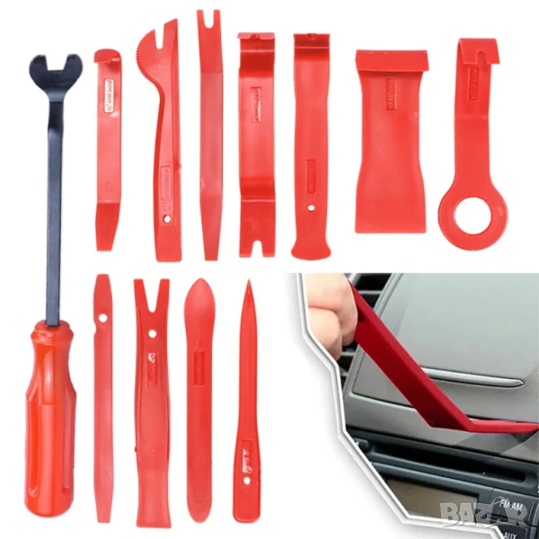 Комплектът инструменти за премахване на автомобилни облицовки се състои от различни инструменти, отлични за премахване и монтаж на автомобилни, морски, мебелни или самолетни облицовки, включително панели на врати, корнизи, лайсни на прозорци, скоби, крепежни елементи, емблеми, панели, радиостанции и др.