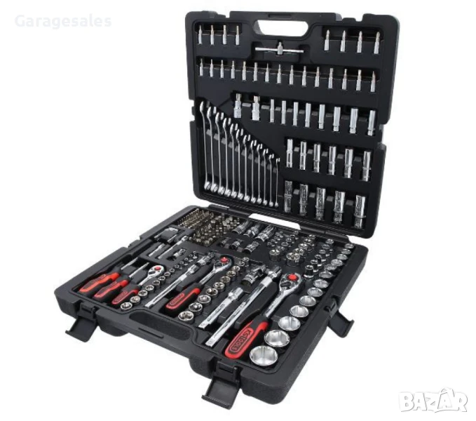 Съдържание: Комплектът включва различни видове ключове, гнезда, тресчотки, удължители, накрайници, отвертки и други основни инструменти;
