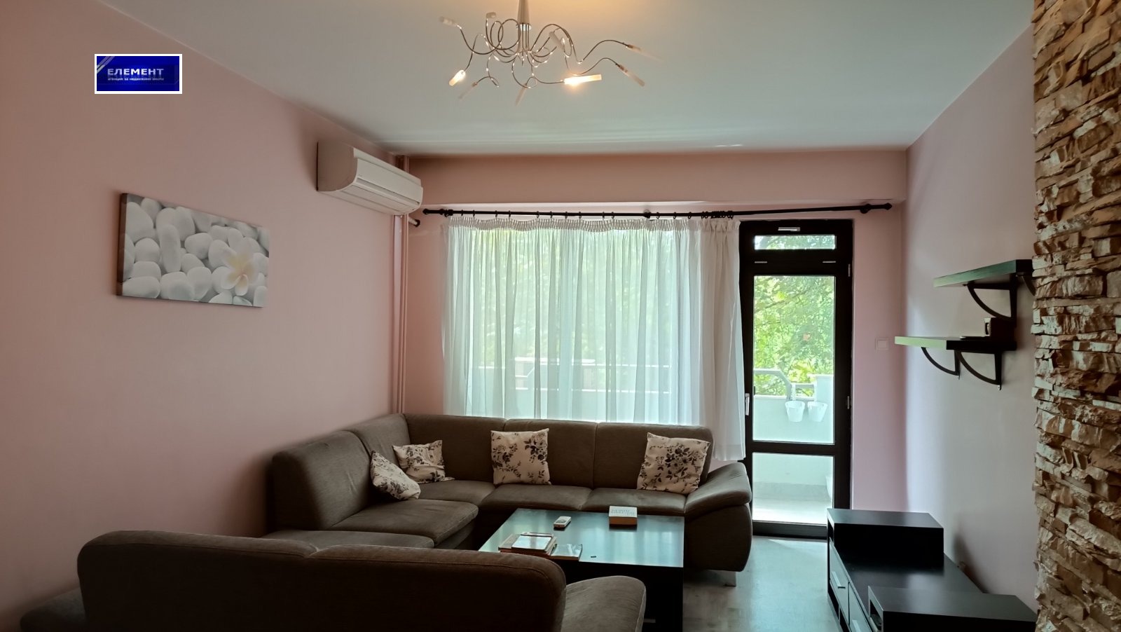 - голям хол с външна тераса, холова гарнитура, голям климатик Daikin, шкаф за телевизор, скрин,