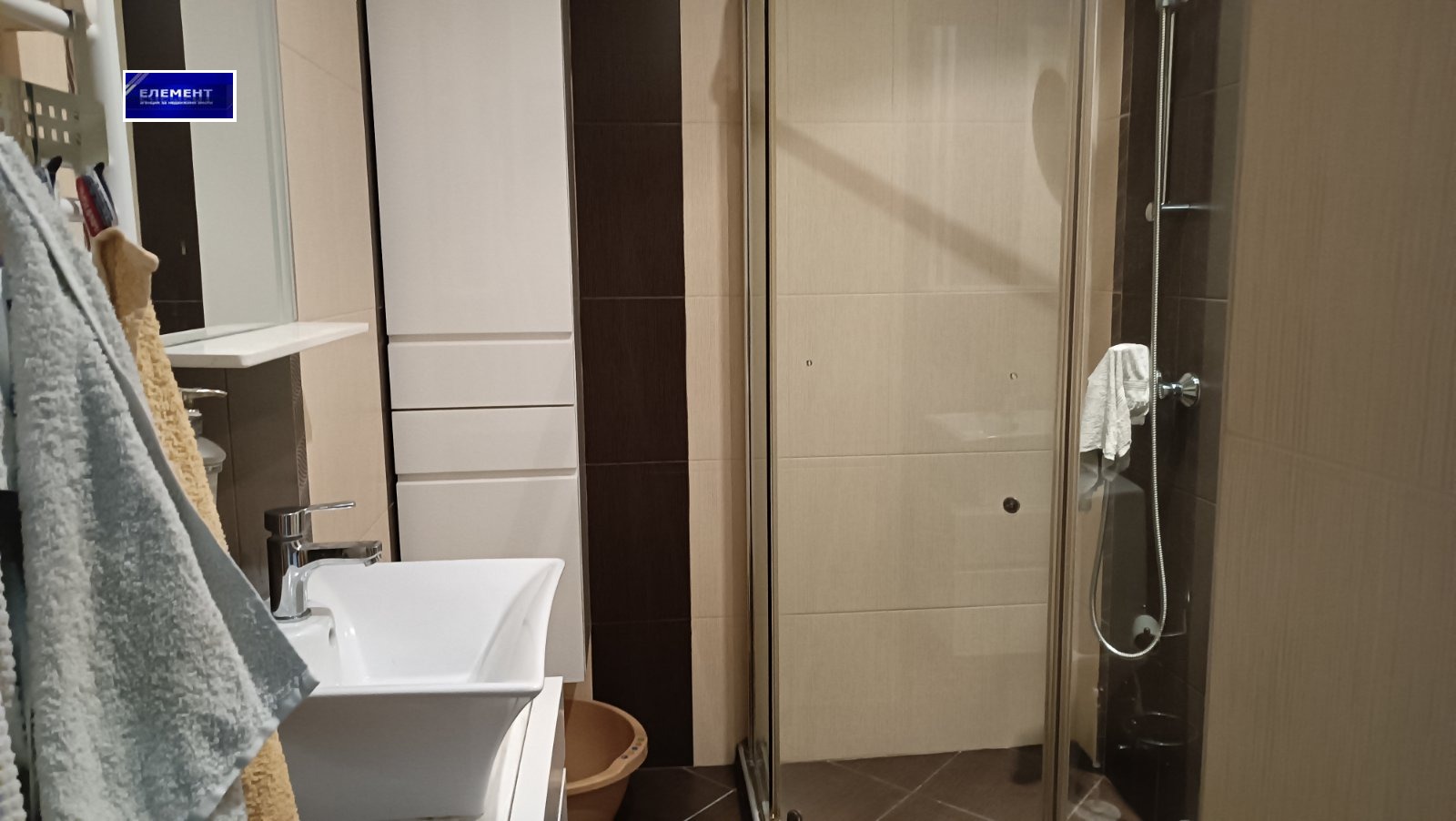 - баня с тоалетна - с душкабина, шкаф под мивка и шкаф за пране и козметика,