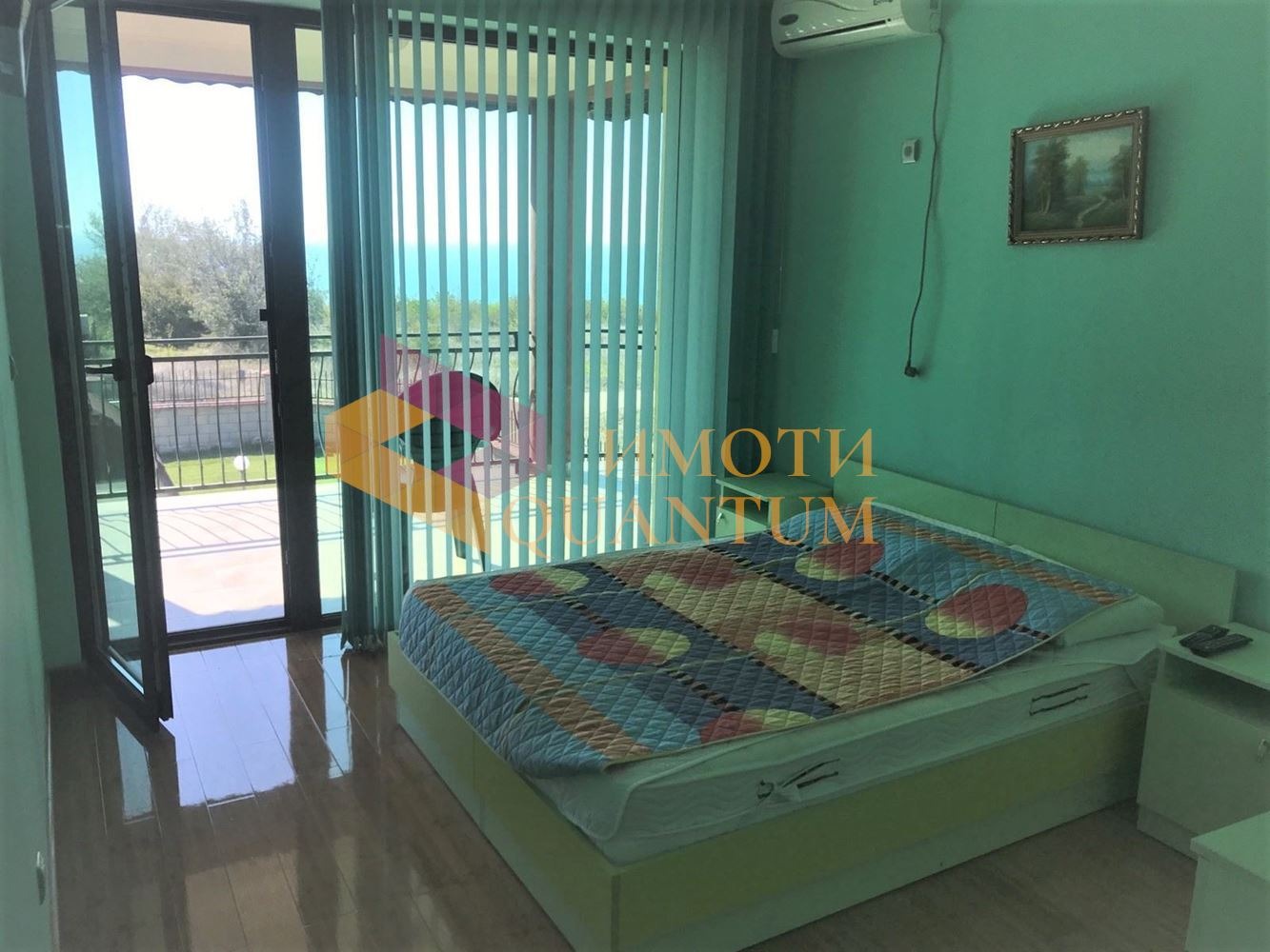 Оферта 1315; МОРСКА ПАНОРАМА ОТ КОТА 0! НОВ БАСЕЙН! Имоти Куантум Ви предлагат самостоятелна двуетажна къща с РЗП 196 кв.м. в близост до голф игрищата до гр. Балчик. Разпределението на къщата е следното: На първи етаж е разположена просторна дневна с кухненска част и излаз на веранда, баня с тоалетна, мокро помещение и стълбищна клетка. От дневната, верандата, както и от целия двор има гледка към морето. На втория етаж са разположени три спални, като към всяка от тях има баня с тоалетна. От всяка спалня се излиза на обща тераса, от която също се разкрива красива морска панорама. Къщата се продава напълно обзаведена и модерно оборудвана.