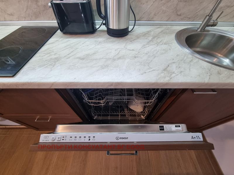Апартаментът е напълно обзаведен и оборудван: кухня, напълно оборудвана със съдомиялна, пералня, хладилник, фурна, микровълнова,