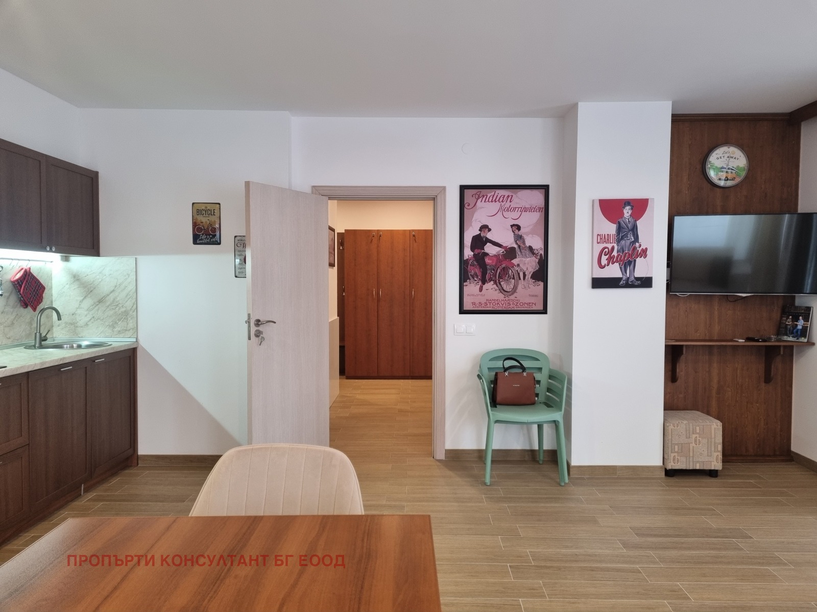 кафе машина, маса за хранене с 4 стола, разтегателен диван, спалня с двойно легло, баня с тоалетна, балкон, smart TV.