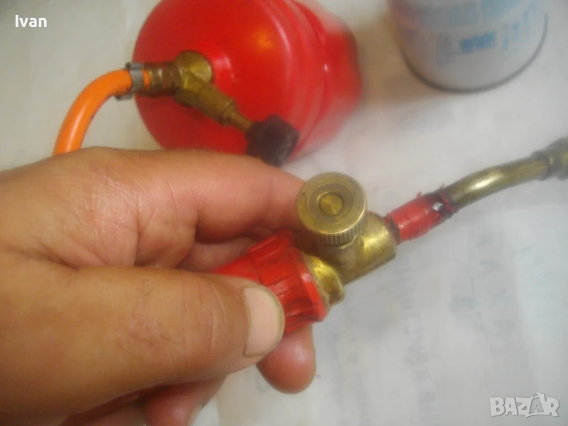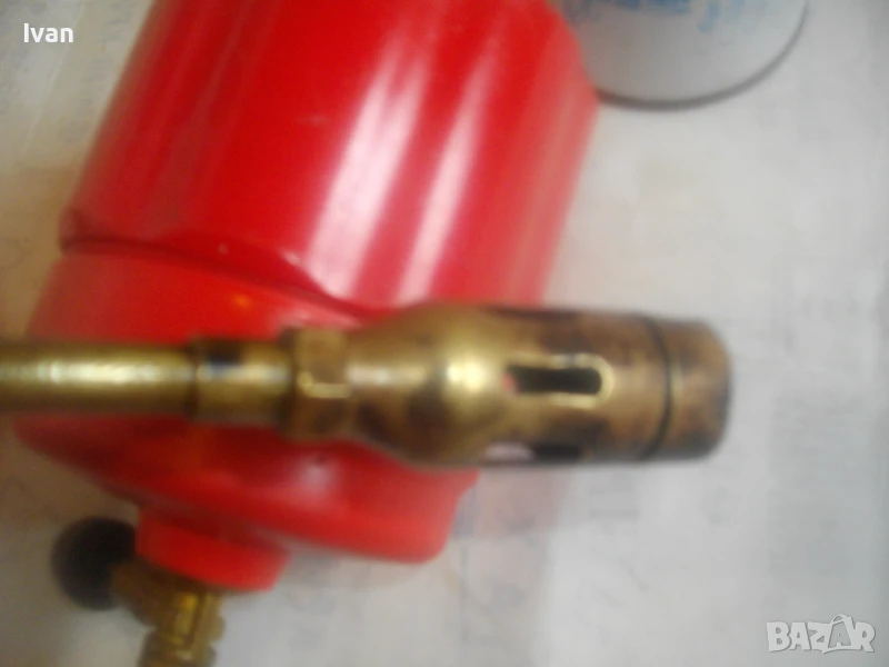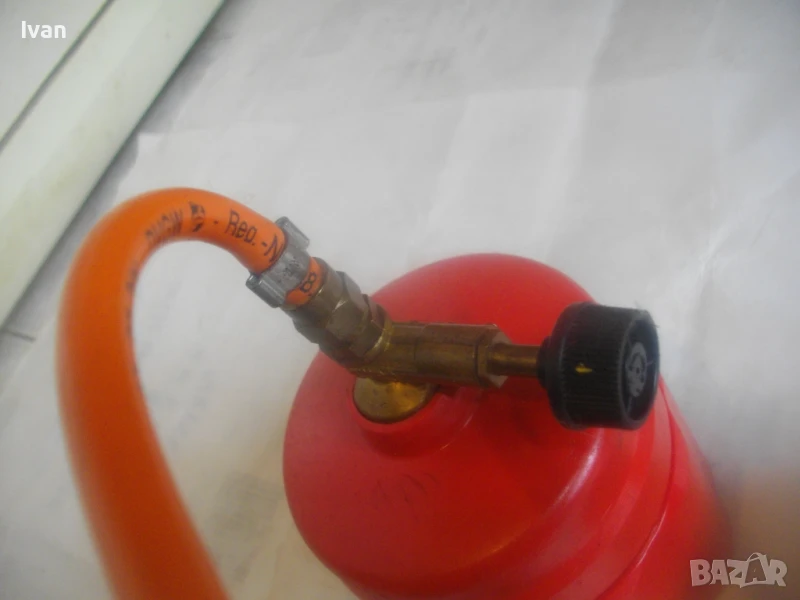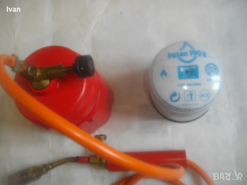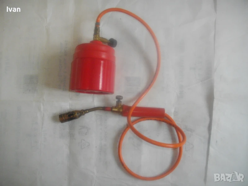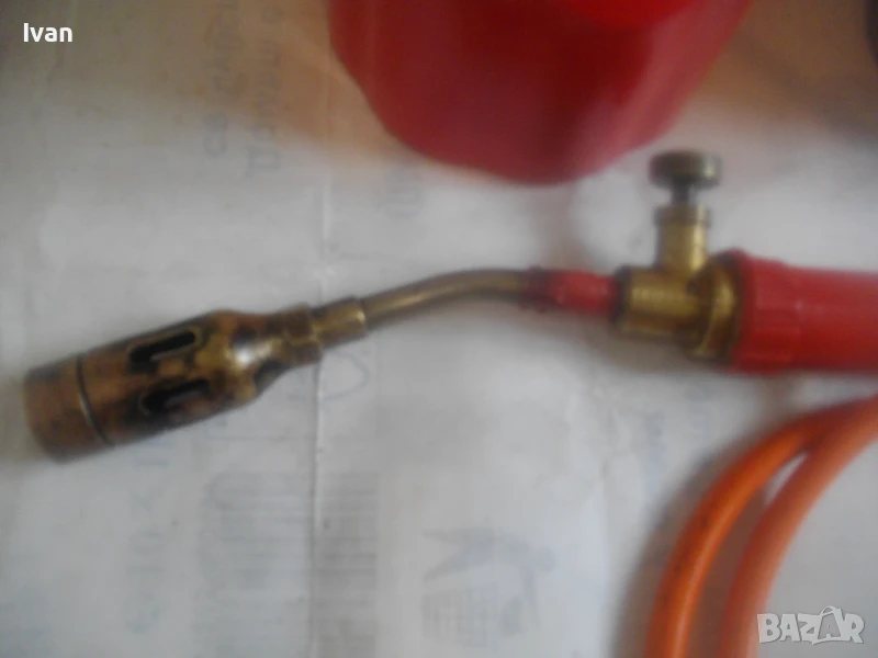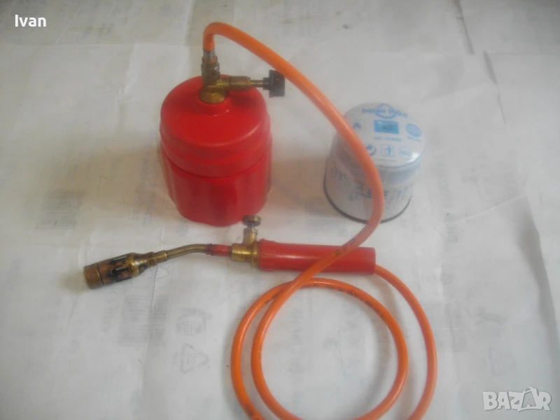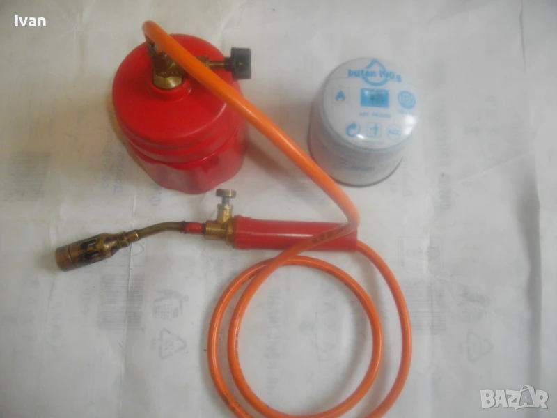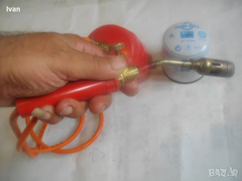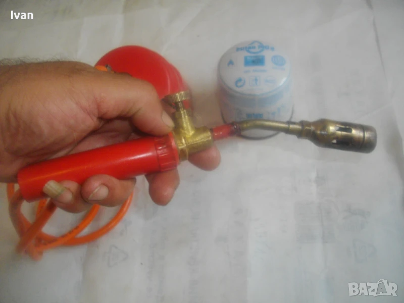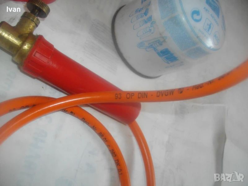 горелка малка, немска професионална с тяло за патрон газ пропан.бутан, маркуч и горелка - 159 лв. Запазен външен вид и добро техническо/работно състояние. Тяло корпус за поставяне на газов патрон за горелка - универсално, на резба двете части на корпуса. Маркуч тип ПВЦ размер 5 мм х 8 мм за налягане до макс 12 бара - упоменато на него. Дължина на маркуча - 140 см. Спирателен бронзов кран на тялото на газов патрон. Горелка мини - тип бижутерска, дължина 250 мм, отпред контактна дюза масивна брнзова ф 20 мм с 8 дупки за пламъка за прецизно рязане/запояване. Бронзов малък спирателе кран. Пластмасова дръжка на резба. Комплектът е ползван, със запазен външен вид и отлично техническо/работно състояние. Има леко спукване на пластмасата на дръжката при резбата, което не пречи на работата.