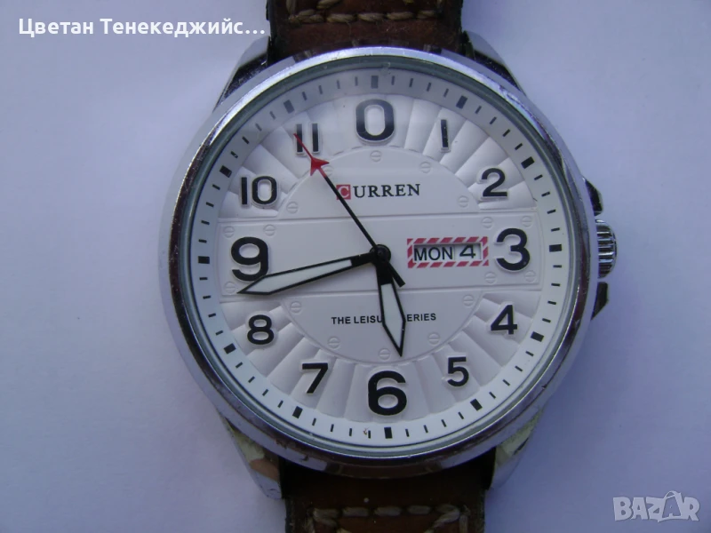 5.Мъжки кварцов часовник Curren.Много добро състояние.Работи точно.Датник с ден и дата.Сменят коректно.Фосфорни стрелки.Водоустойчив.Кожена каишка.Диаметър на касата без коронката 45,5мм.-35лв.