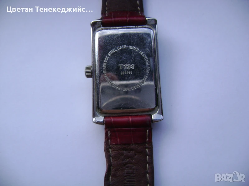 4.Немски дамски часовник ТСМ.Работи точно.Водоустойчив 30м.Квадратна каса 24мм на 32мм.Кожена каишка.-25лв.