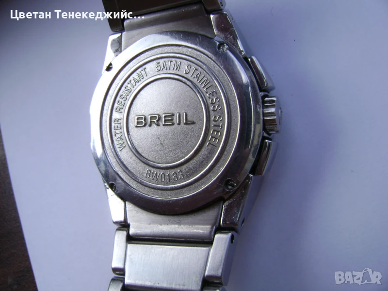 2.Дамски часовник Breil Chronograph.Работи точно.Датник под циферблата.Всички малки стрелки са активни.Хронометър и 12/24 часа.Водоустойчив 5 атм.Интегрирана метална верижка тип пеперуда-къса.34мм на 26мм размер на часовника-70лв.