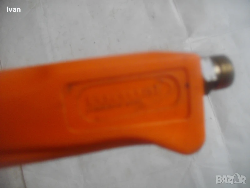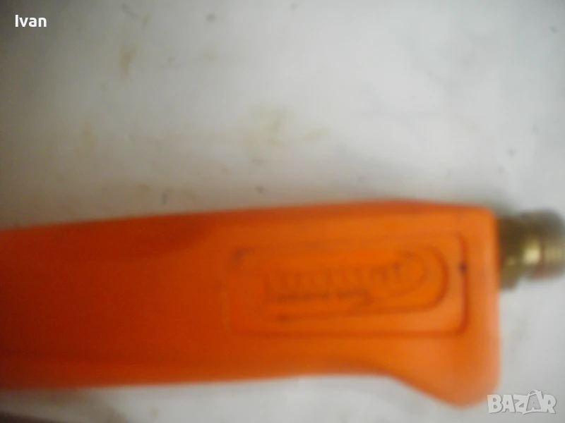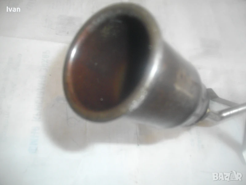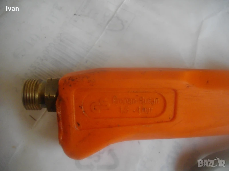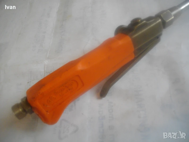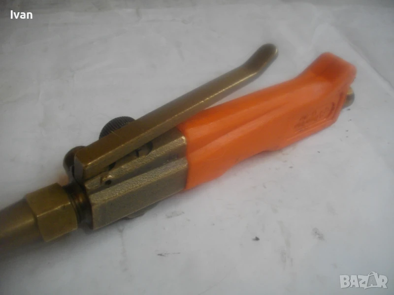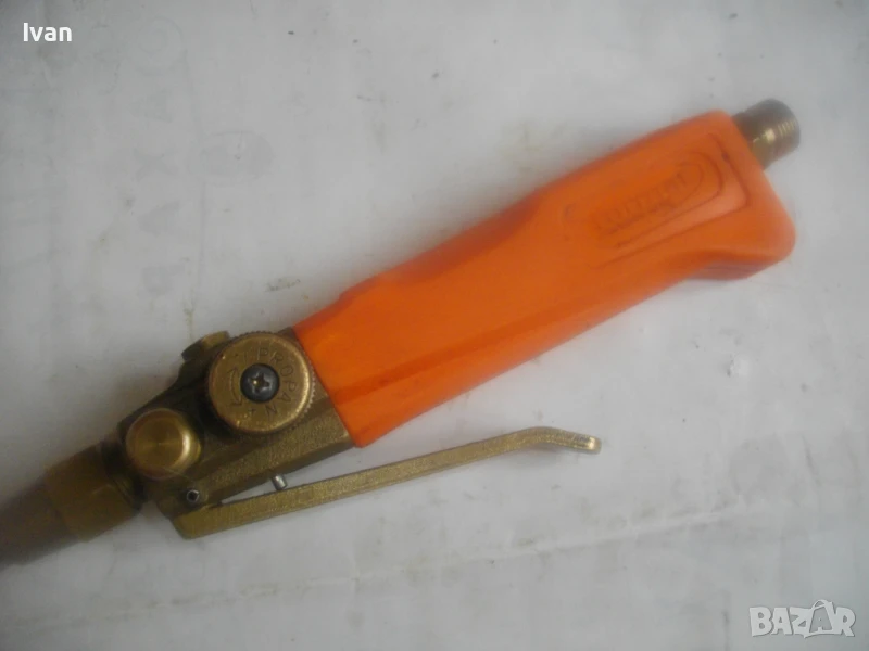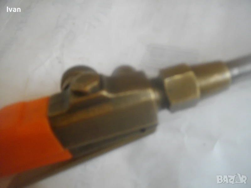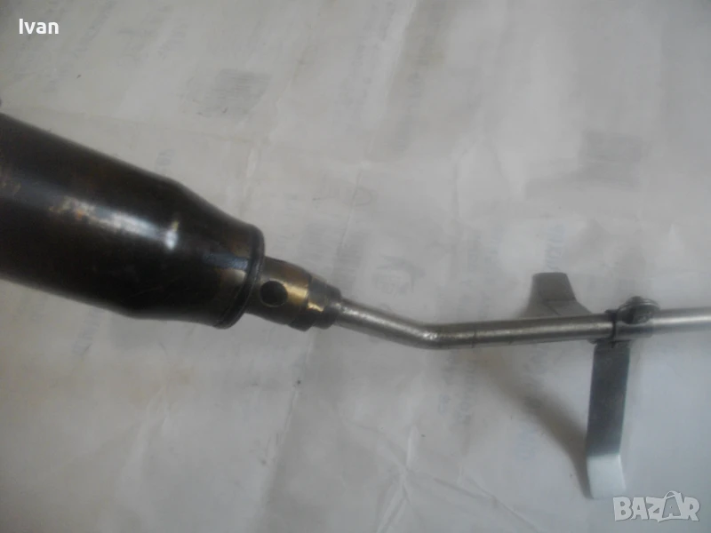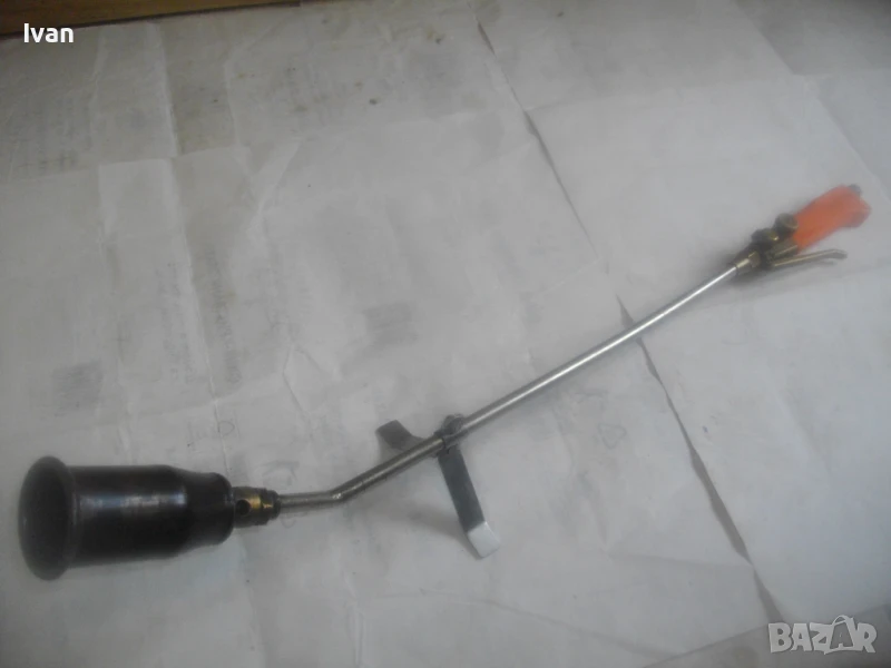 Много запазен външен вид и отлично работно състояние, без забележки. Бронзова глава на дръжката, бронз спирателен кран, бронз дълъг спусък, чаша отпред масивна дебела метална с диаметър ф 55 мм и 1 голяма дупка за пламъка.Стойка за самостоятелен обърнат стоеж. Цялостна дължина на горелката 82,5 см. Отзад резба М14 стандартна за скачване към гайка на маркуч.Тегло на горелката - 1,0 кг. Цена 199 лв. (101.75 €)