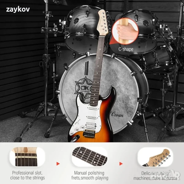 електрическа китара за начинаещи, комплект с гриф от пурпурно дърво, тяло от масивна топола, гриф от канадски клен с C-образен профил, класически дизайн, удобно прилягане.
