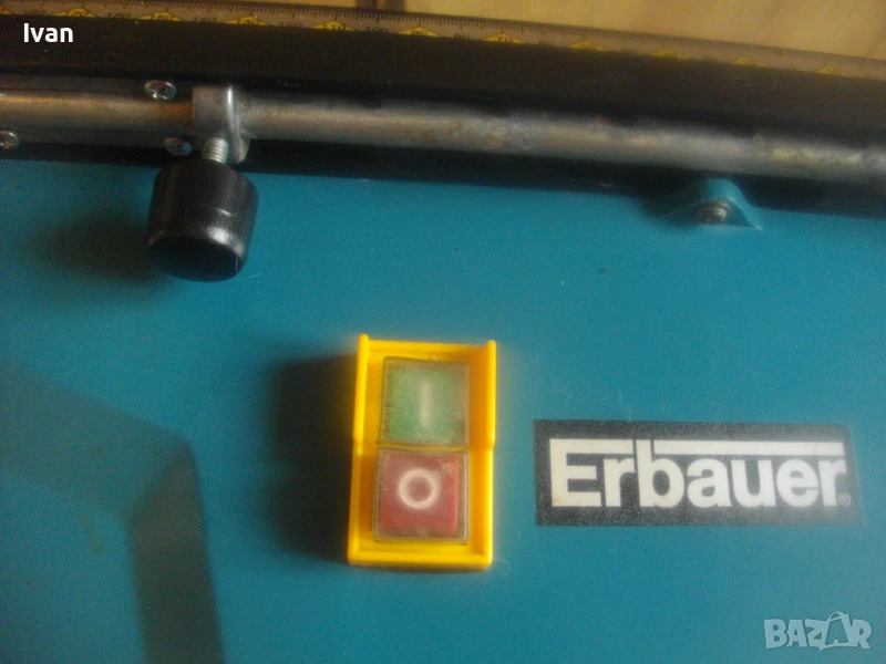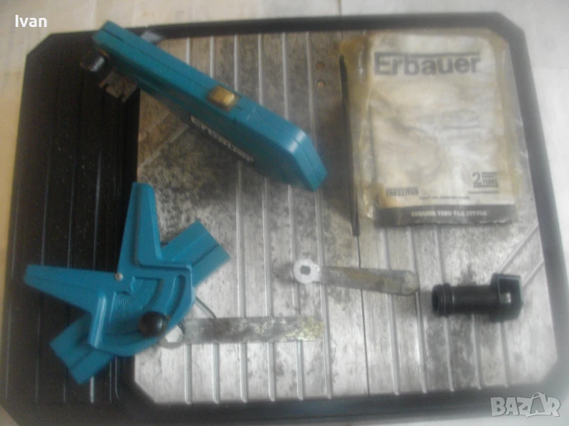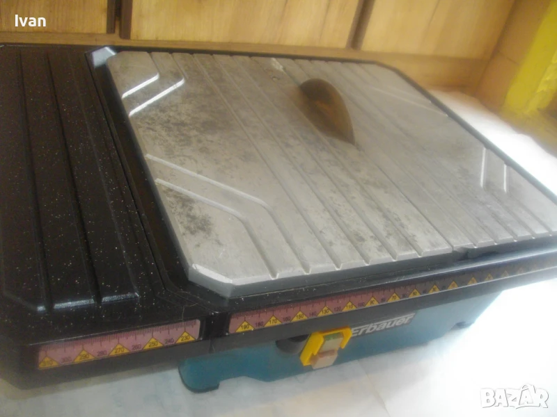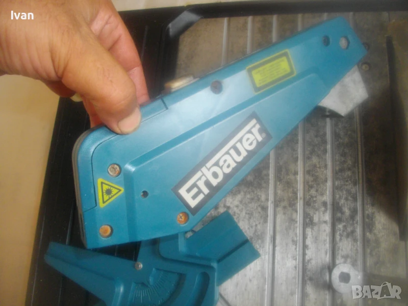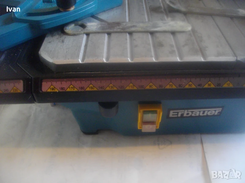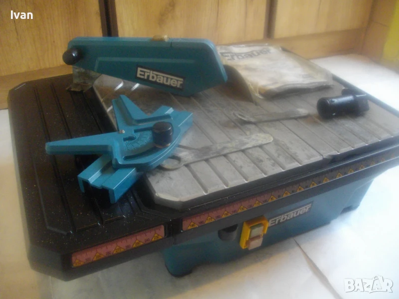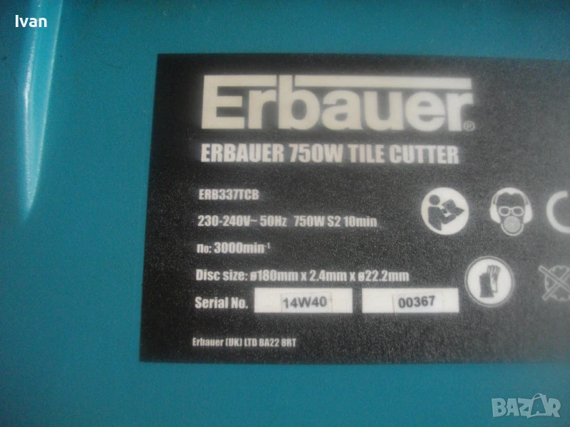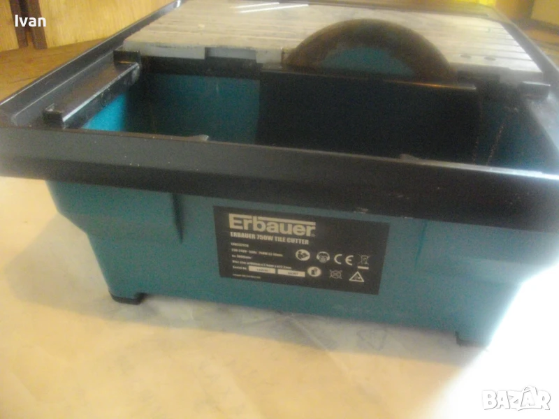 Почти нова, силна и мощна 750 ватова ел. машина за рязане на всякакви плочки теракот гранитогрес камъни облицовки тротоарни плочи и други керамични и бетонови повърхности с дебелина до 30 мм, с лазер на капака на диска и вградена вана за вода при мокро рязане. Марка и модел на машината - Erbauer ERB 337TCB