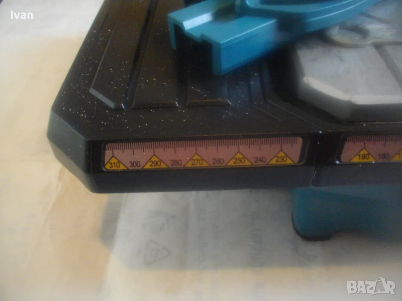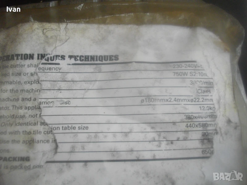 Машината реже плочи с дебелина до 30 мм. Мощност 750 вата, скорост 3000 об/мин, диск поставен диамантина почти нова ф 180 мм. Плот на машината алуминиев 56,5 см с допълнителн разтягащ се плот още 16,5 см, общо дължина на плота за големи плочи дължина 72,5 см. Ширина на плота 43,5 см. Височина на машината от земята 18 см без диск. S2 време на работа с 1 пуск - 10 мин. Плота е разграфен от двете страни до 170 мм от двете страни на диска.Предни 2 пускови бутони със силиконово антипрахово покритие. Кабел с вградено място за навиване отзад на машината. Щепсел английски с бушон защита - носете си адаптер преобразувател ЕС стандарт. Вана за вода при мокро рязане - вградена. Капак над диска - с лазер клас 2, за прецизно и съвсем точно рязане до милиметър. Към машината са налични книжката указания на англ. език, 2 броя гаечни ключове за смяна на диск, ъглов линал паралел при рязане под ъгъл 0-45 градуса.