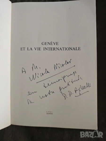 Genève et la vie internationale С автограф от Mr. P. P. Spinelli, Under-Secretary in charge of the European Office of the United Nations in Geneva За оперния певец Никола Николов
